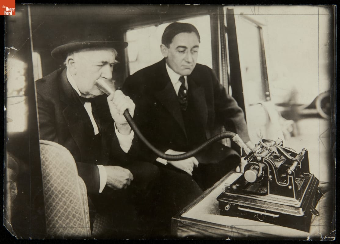 Thomas Edison and C. L. Edholm Using Dictating Machine in an Automobile, circa 1920