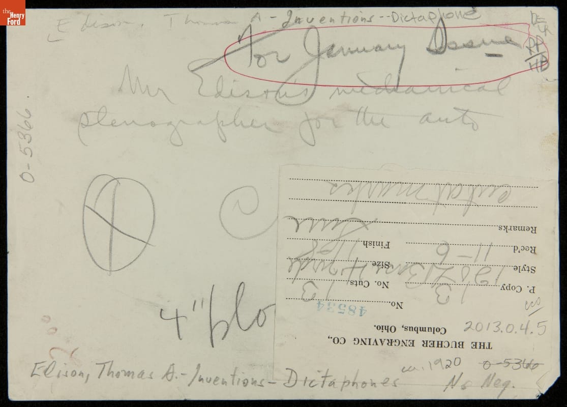 For January Issue / Mr Edison's mechanical / stenographer for the auto / C.L. Edholm [man with Edison]
