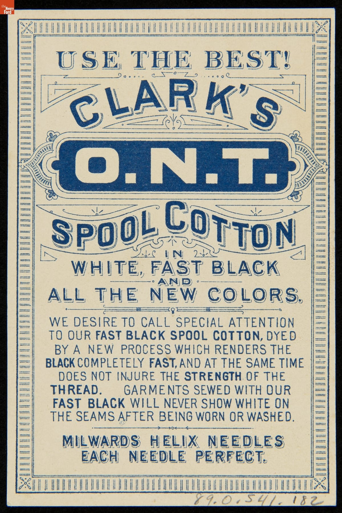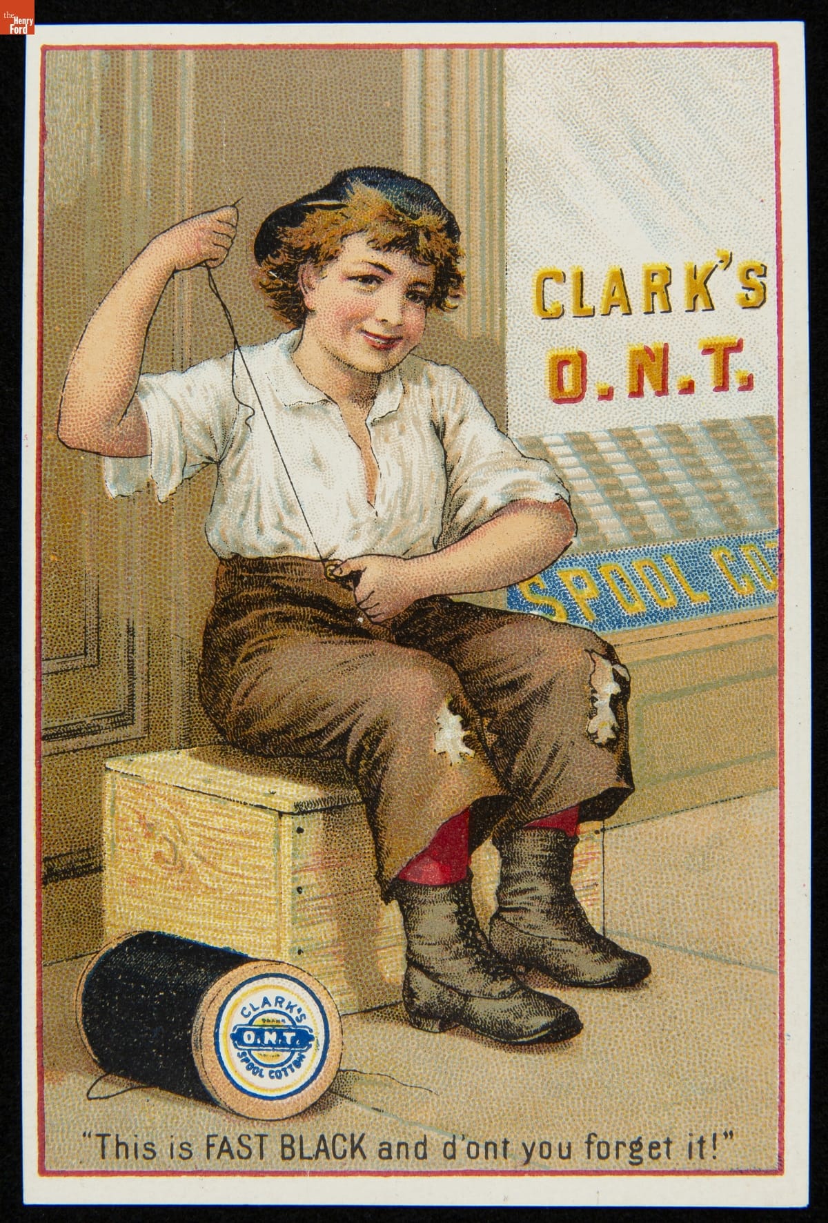 Trade Card for Clark's Spool Cotton, "This is a fast black and don't you forget it!," Clark's O.N.T., 1880-1890