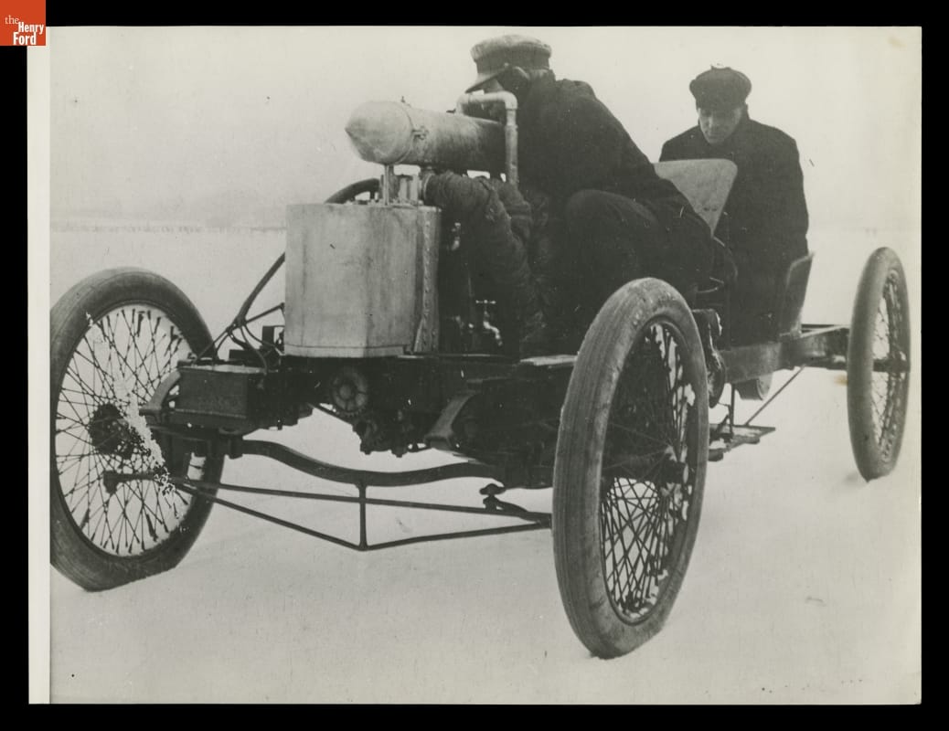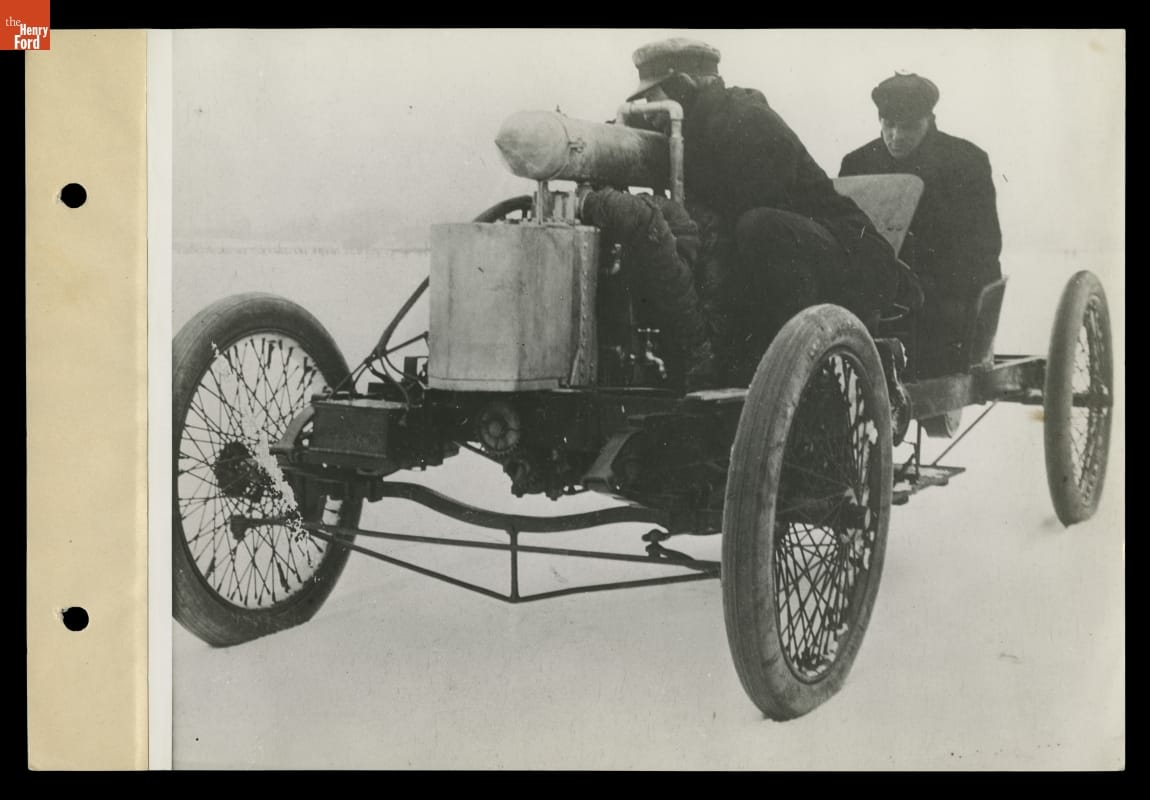On January 12, 1904, Henry Ford and his riding mechanic Ed "Spider" Huff set a world speed record of 91.37 miles per hour on a frozen Lake St. Clair, northeast of Detroit. The feat raised Ford Motor Company's profile, and the "Arrow" racer -- though referred to as the Ford "999" -- became a common subject in Ford advertisements.