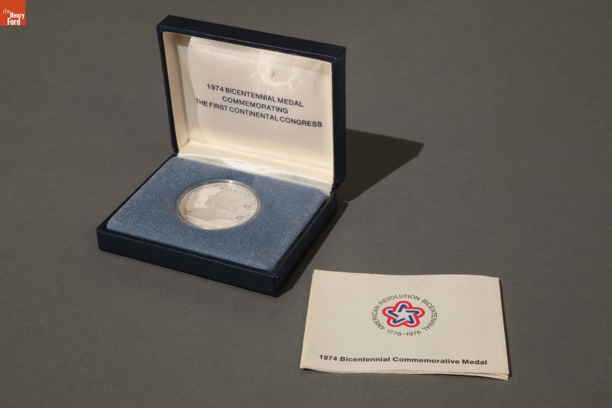 The celebration of America's Bicentennial began in earnest in 1974. Two hundred years before, in 1774, delegates from throughout the American colonies met in Philadelphia and convened the first Continental Congress. Their meeting led to the creation of the Declaration of Independence two years later. The U. S. Mint issued this commemorative medal recognizing the importance of the first Continental Congress.
