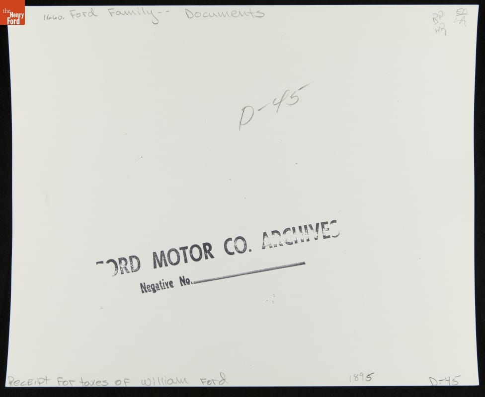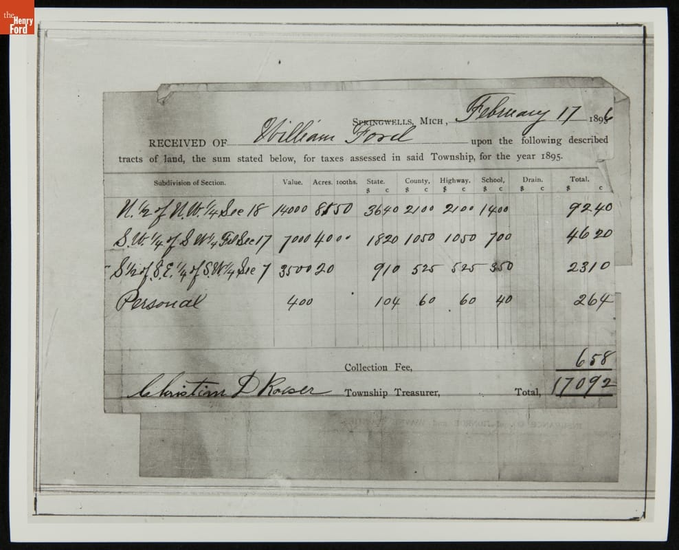 When William Ford, Henry Ford's father, emigrated from Ireland in 1847 at the age of twenty he had little wealth. William settled near family in southeast Michigan and eventually purchased a tract of land. By the late 19th century, William was a prosperous farmer. In 1896, the date of this receipt, he owned over two hundred acres of farmland in Wayne County.