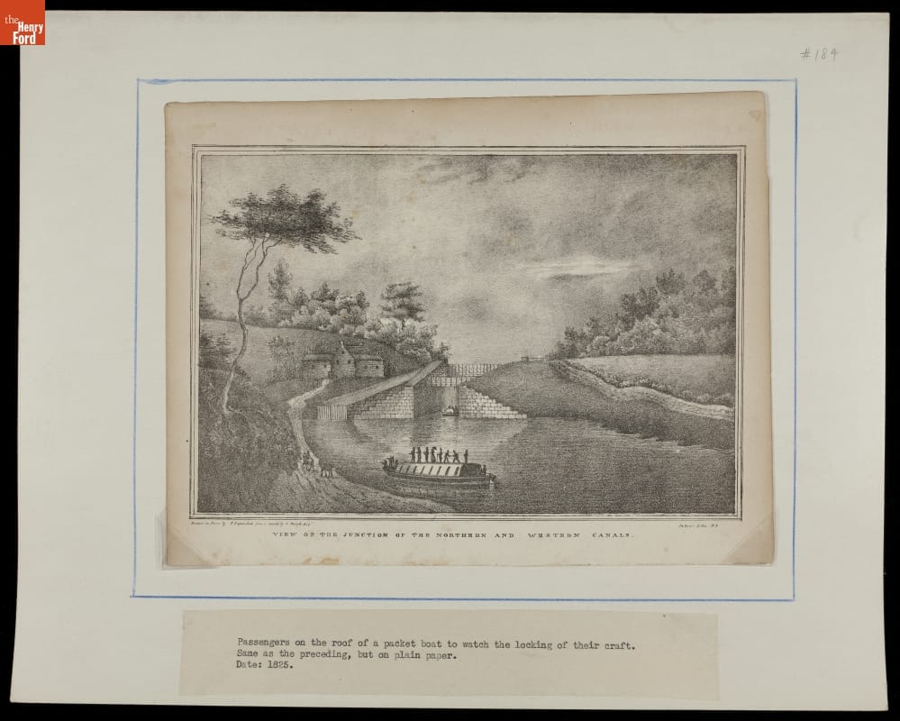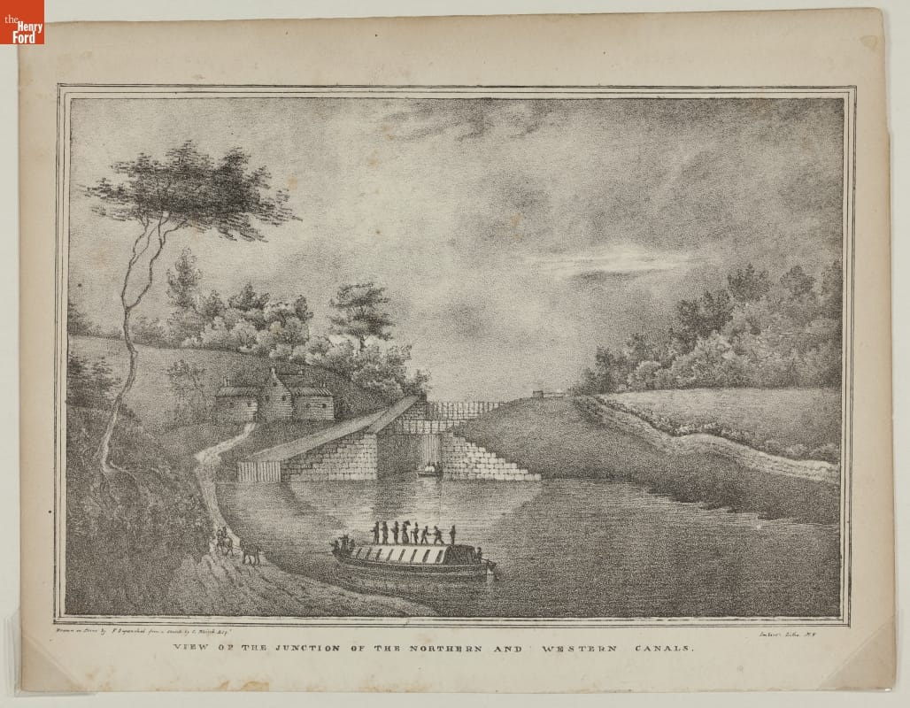 Canals opened new lands to settlement and commerce in the first half of the 19th century. New York's Erie Canal, completed in 1825, connected Albany with Buffalo. It also joined with other canals to make more areas of the state accessible. This print shows the junction of the "Northern" (Champlain) and the "Western" (Erie) canals.