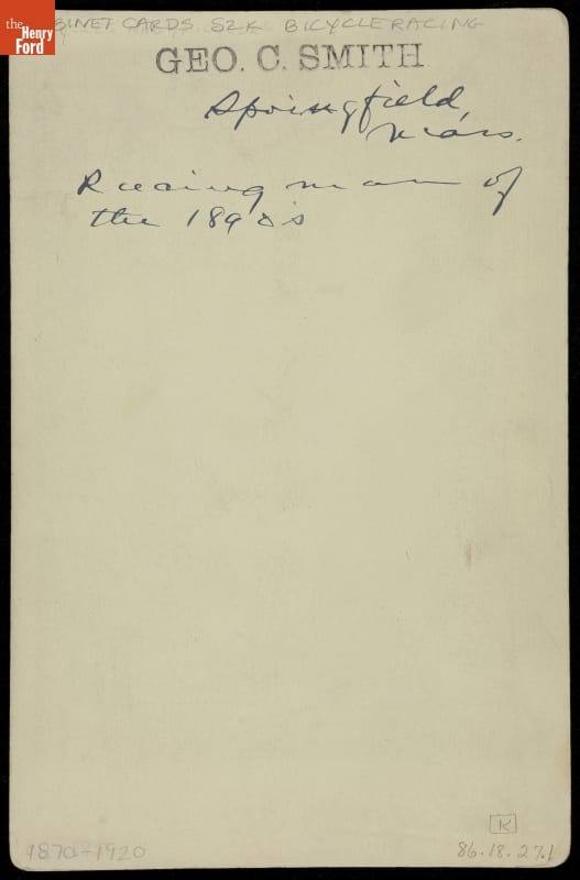Hand-written in black ink on back: Springfield, Mass. -- Racing Man of the 1890s.