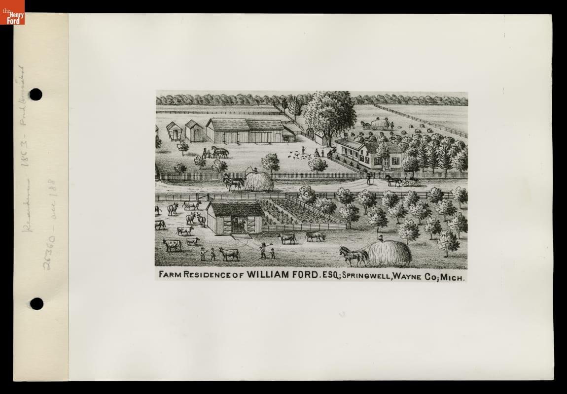 In the 19th century, publishers produced atlases for counties all over the United States. One of the illustrations in this atlas is an aerial view of the William Ford Farm in Springwells Township -- now Dearborn, Michigan. Industrialist Henry Ford, William and Mary Ford's eldest son, was born in the farmhouse on July 30, 1863, and he grew up on this farm.