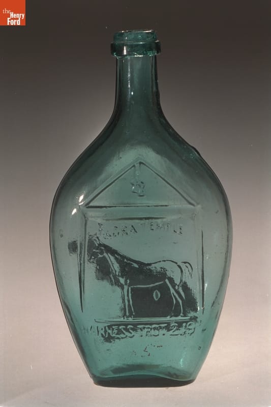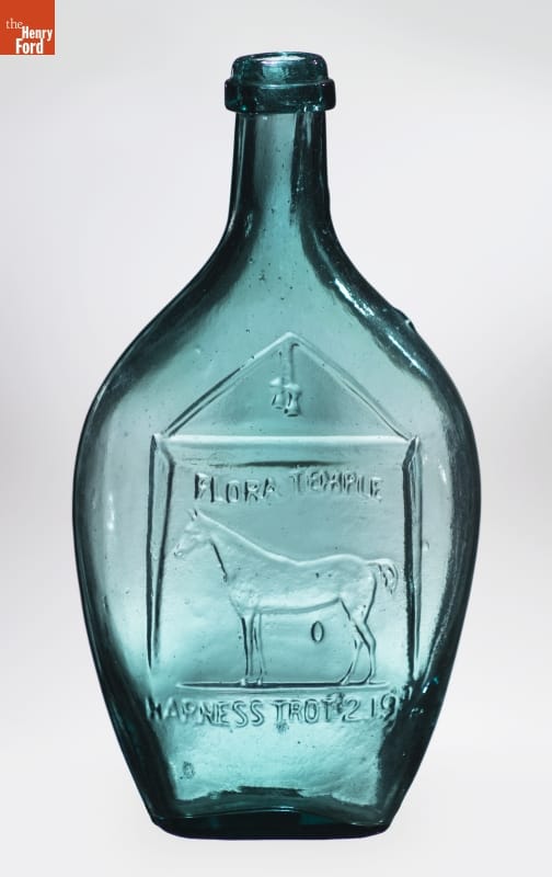 Glass factories in America began producing inexpensive, mold-formed flasks in the early 1800s. Many figured flasks were decorated with symbols of national pride and images of famous individuals -- or in this case a famous racehorse. Flora Temple won 95 harness races during the 1850s and 1860s. Not only was this "bob-tailed" mare immortalized in glass, but also in the song "Camptown races."