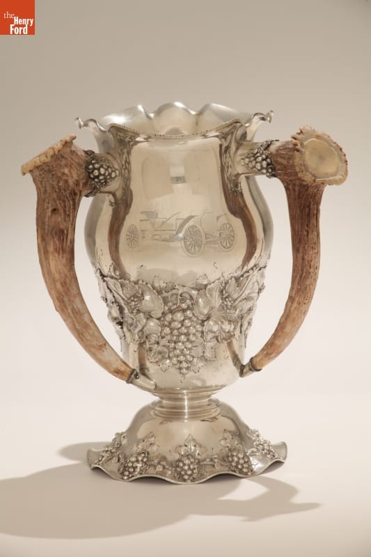 Engraved on front of trophy: "CLIMB TO THE CLOUDS" / MT. WASHINGTON / N.H. / JULY 12th 1904 / WON BY / HARRY S. HARKNESS / TIME 24 MIN. 37 SEC / DISTANCE 8 MILES-ELEVATION 6293 FEET Impressed on bottom: S (within a winged circle) / STERLING / 23 * 57 / 20 T