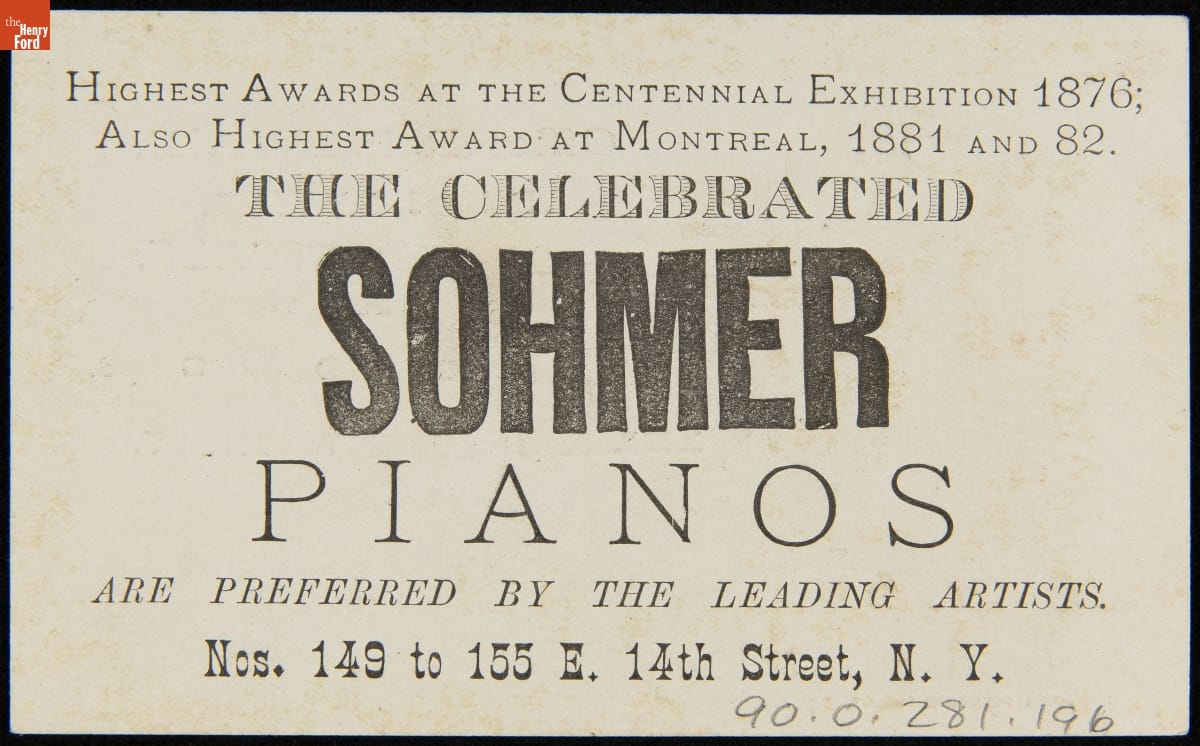 Trade Card for Sohmer Pianos, Sohmer Piano Co., 1882-1900