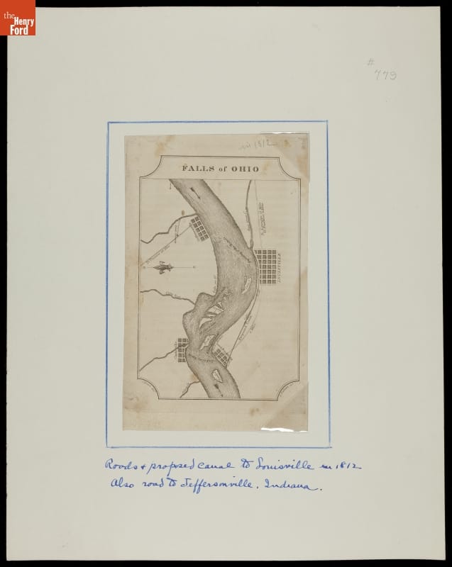 Description beneath: Roads and proposed canal to Louisville in 1812. Also road to Jeffersonville, Indiana