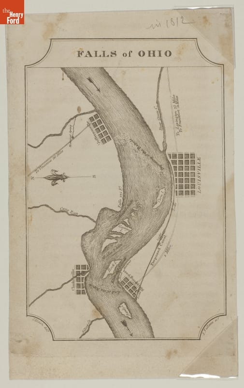 This 1812 map engraving focuses on the falls of the Ohio River near Louisville, Kentucky. The map features roads in Indiana and Kentucky, and a proposed canal to skirt the falls.