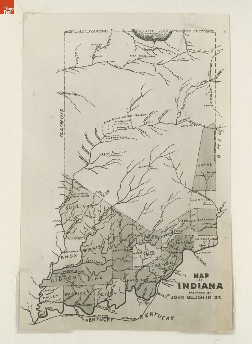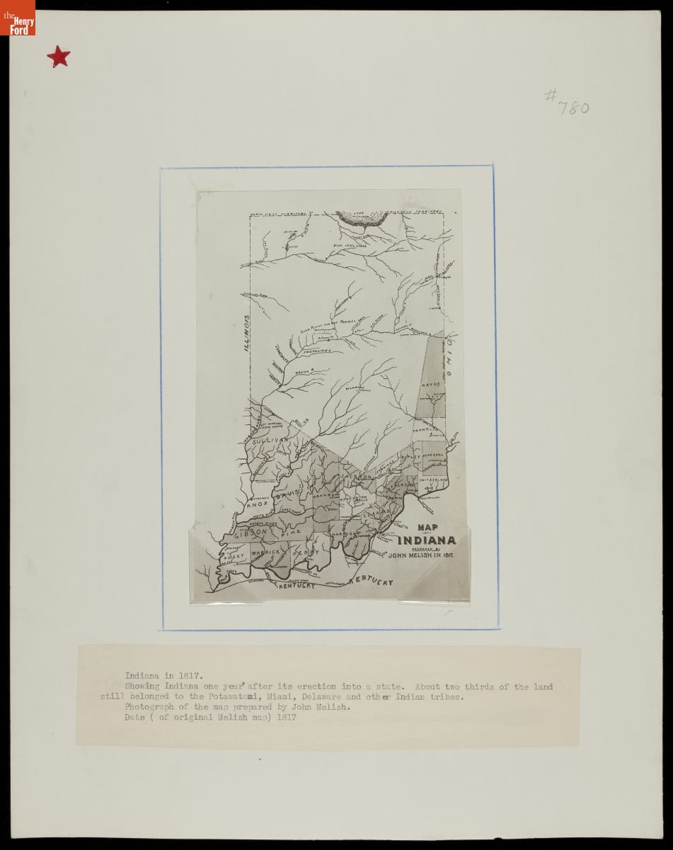 Description beneath: Indiana in 1817. Showing Indiana one year after its erection into a state. About two thirds of the land still belonged to the Potawatoni, Miami, Delaware and other Indian tribes. Photograph of the map prepared by John Melish. Date (of Original Melish Map) 1817