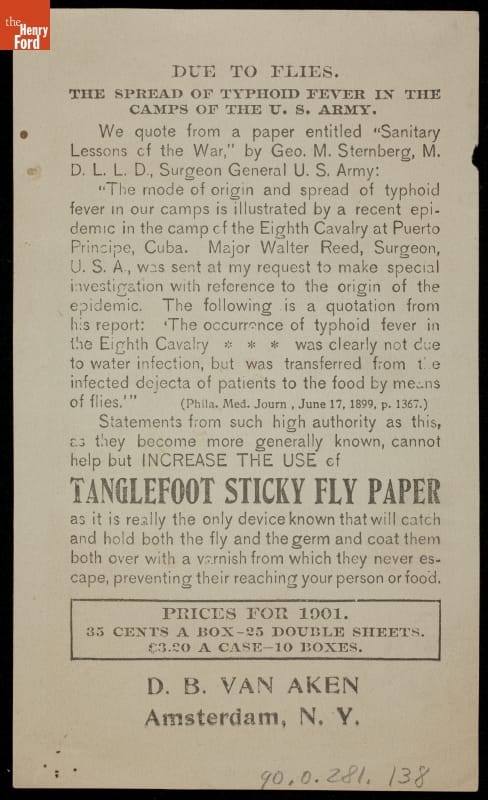 In this trade card advertising Tanglefoot flypaper as "a boon to invalids," a frail patient is saved from further disease and annoyance by the strip of flypaper on her bed, bristling with dead flies. During the turn-of-the-century heyday of America's interest in newly discovered germ theory, Tanglefoot advertised that their nontoxic flypaper (as opposed to common arsenic flypaper) caught "the germ with the fly."