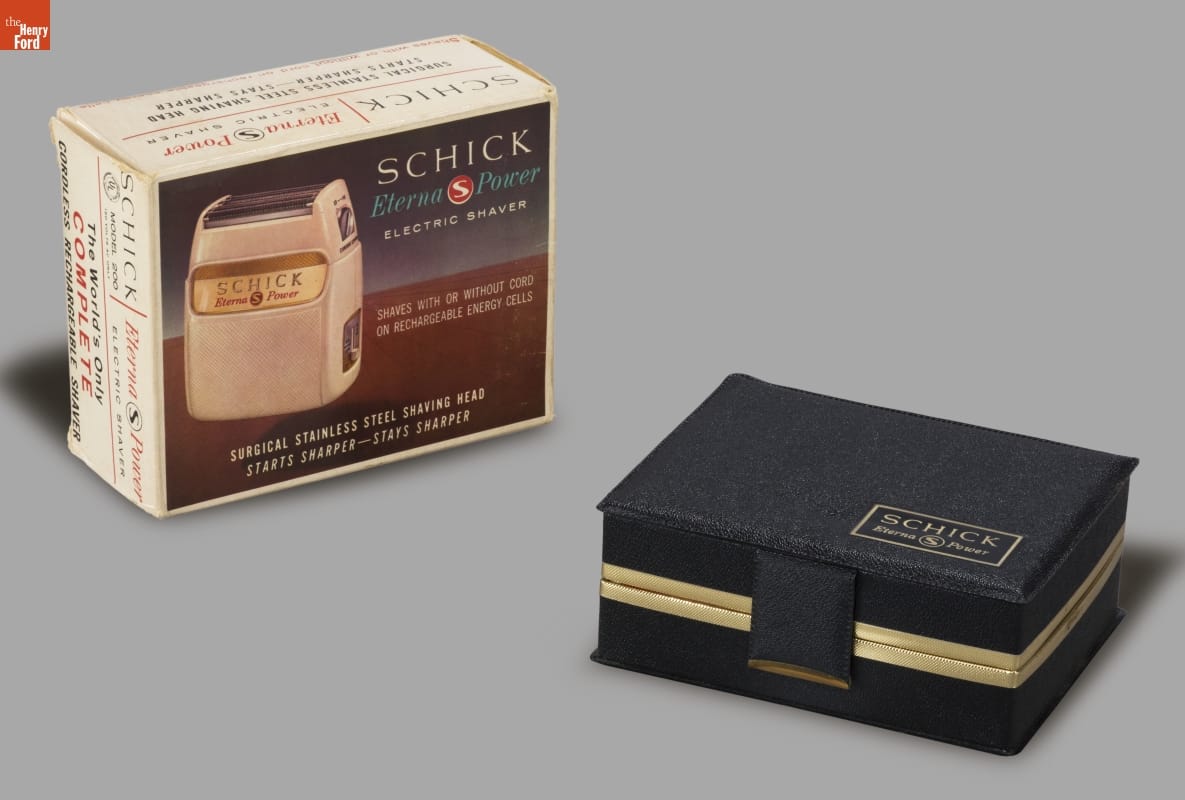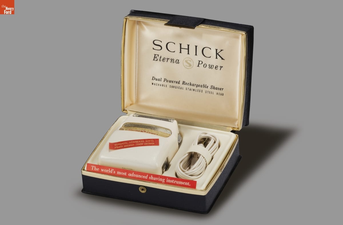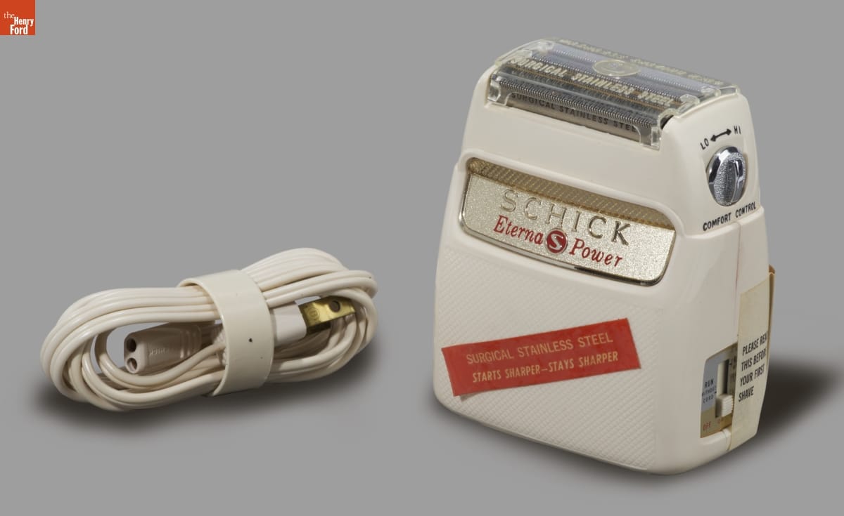 Jacob Schick patented the first successful electric razor in 1930 and began manufacturing his invention. The razors removed facial hair without lather or water, relying on an electric motor to move the cutting blades. Innovations and modern designs followed. Schick's company contracted with Mel Boldt and Associates to design the distinctive look of this razor from the 1960s.
