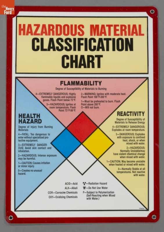 A safe workplace benefits both employees and employers. Warning signs alert workers of possible dangers that may cause harm -- and help prevent accidents and loss of valuable worktime. Informational signs, like this one from the 1990s, remind readers about potentially hazardous materials used in their area and how to stay safe when working with them.