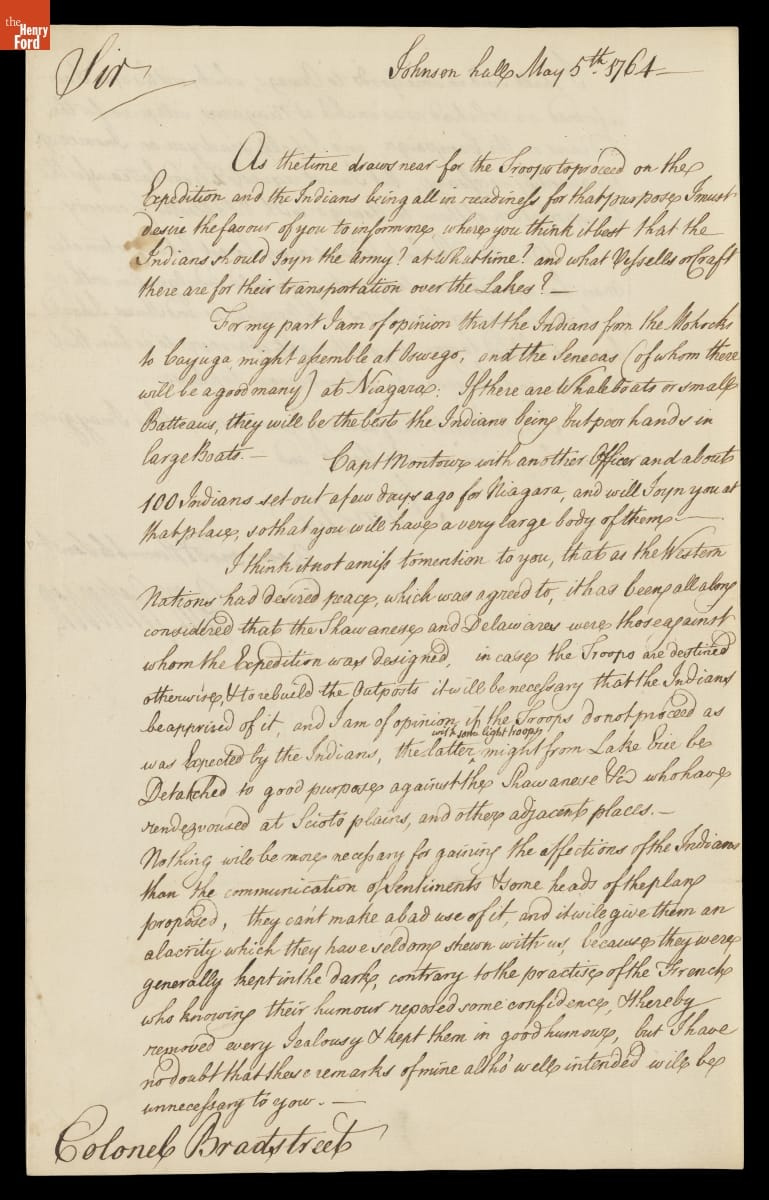 Letter from William Johnson to Colonel John Bradstreet Regarding Relations with Various Indigenous Tribes, May 5, 1764
