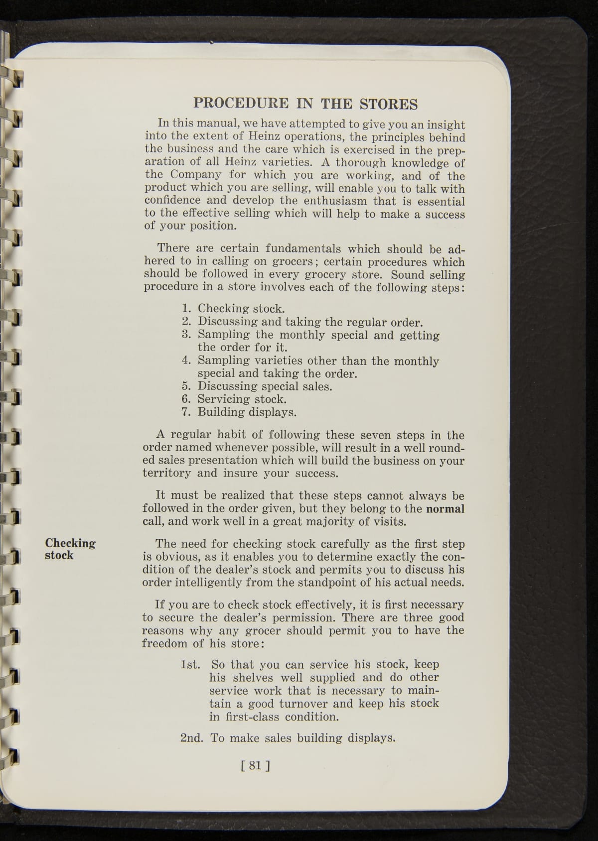 The H.J. Heinz Company employed a robust salesforce to sell its products. In addition to annual conventions where salesmen -- often known as travelers -- would learn about Heinz products, marketing strategies, and the Heinz brand philosophy, salesmen were also given manuals, like this one, which included things like company history and instructions for selling products and setting up displays and demonstration tables.