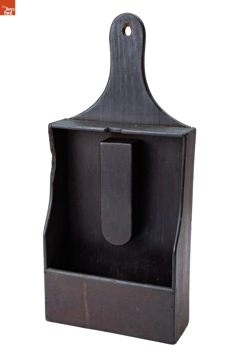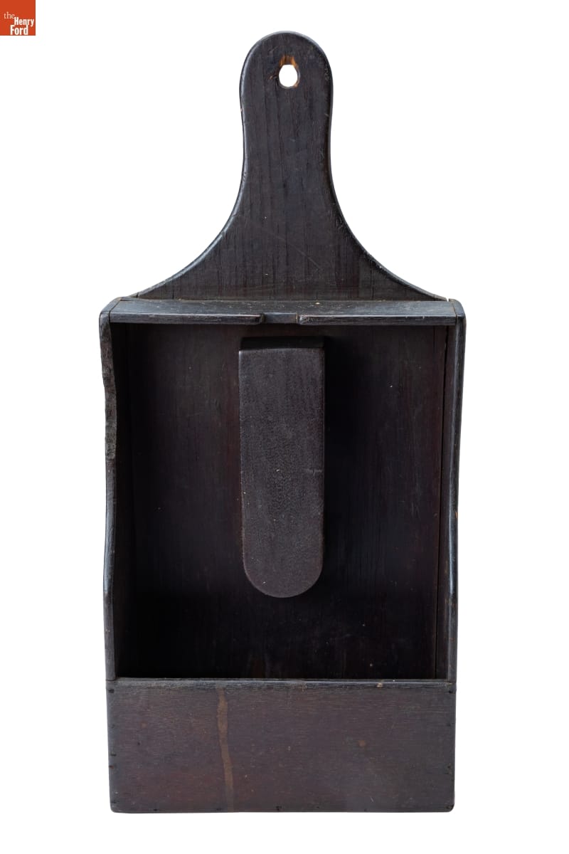This wooden tray or "box" held knives, forks, spoons, and other table utensils. A person would carry this inexpensive tray to the table to dispense cutlery. This tray could be hung on a wall, keeping it out of the way until needed.