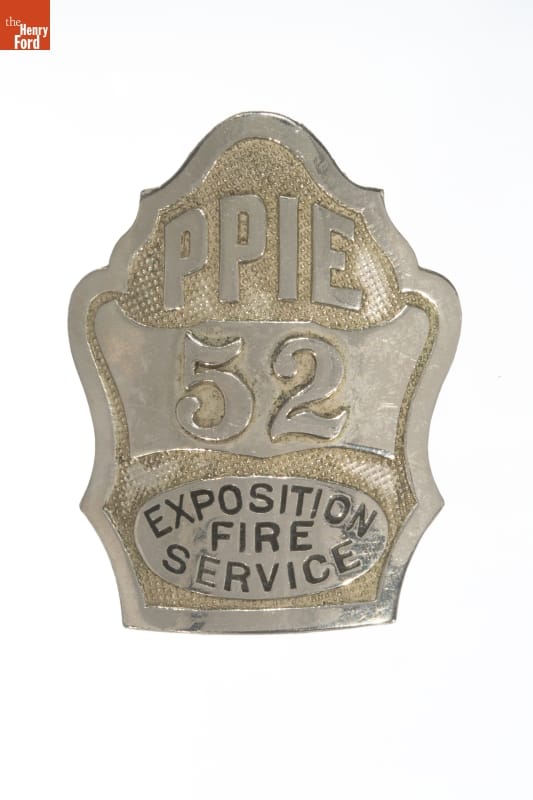World's fairs and expositions, in many ways, are small cities. Buildings and property need to be protected from fire and vandalism, and visitors need to feel secure. Fair planners hire police, firefighters, and security personnel to make the fairgrounds safe for everyone. This badge identified firefighters at the 1915 Panama-Pacific International Exposition in San Francisco.