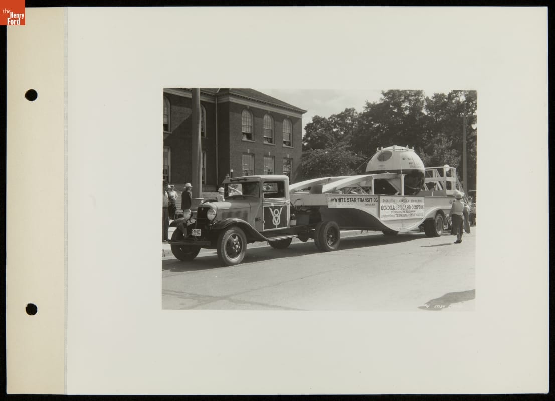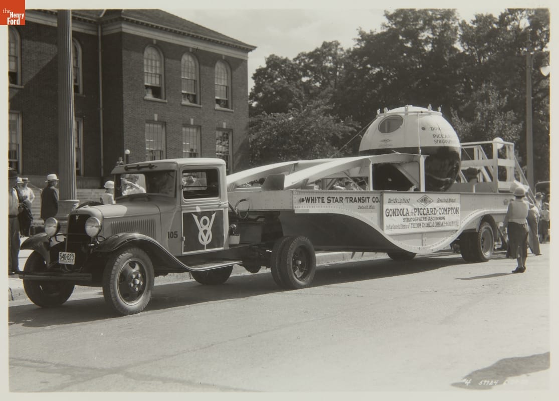 The Piccard-Compton Stratosphere Balloon launched in August 1933 at the Chicago World's Fair, piloted by Lt. Commander "Tex" Settle. The magnesium gondola and hydrogen balloon quickly crashed soon after launch due to an open valve. It is shown here in June, hauled by a Ford V-8 truck. Jean and Jeannette Piccard successfully relaunched it in October 1934 from Ford Airport.