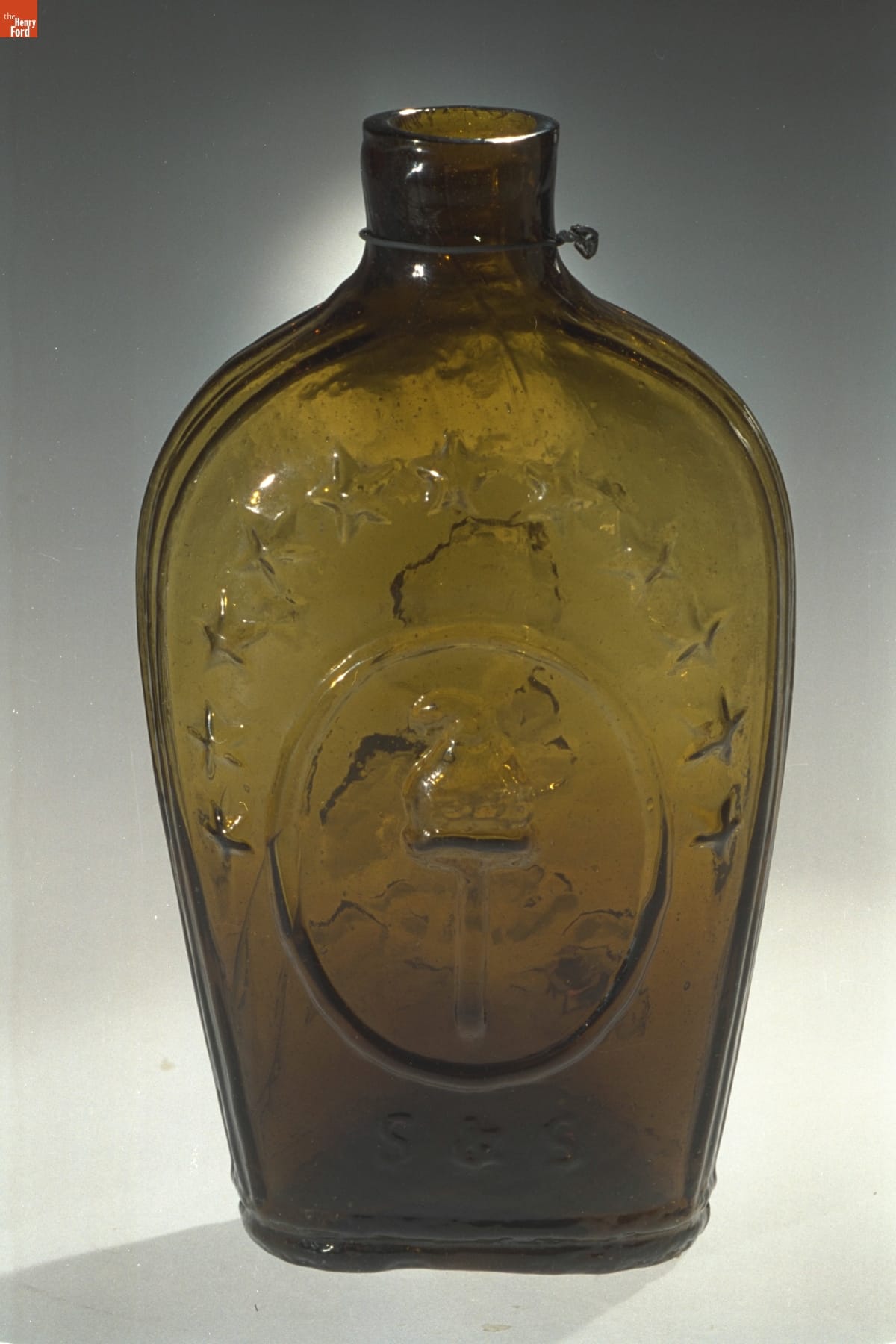 Glass factories in America began producing inexpensive, mold-formed flasks in the early 1800s. These figured flasks, often decorated with symbols of national pride or political or cultural affiliation, appealed to America's common man. In the mid-1820s, General Lafayette, a French aristocrat who helped America win its independence, revisited the United States. His image adorned flasks commemorating his tour.