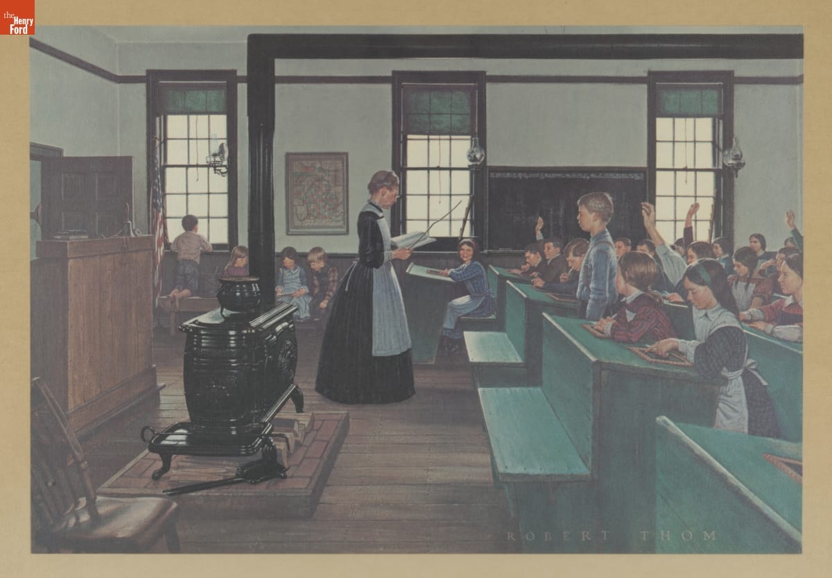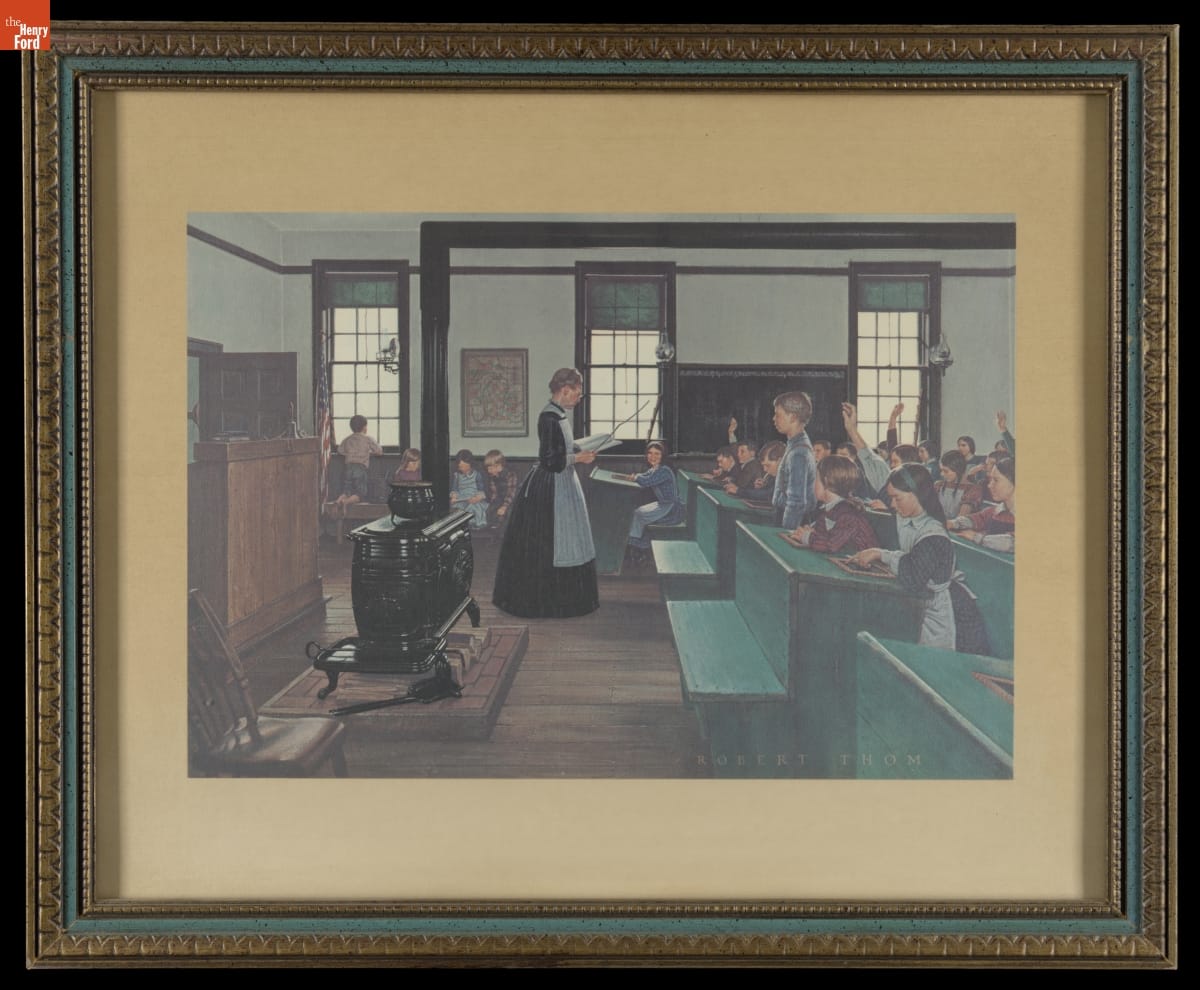 Michigan Bell Telephone Company commissioned Michigan-born artist Robert Thom (1915-1979) to illustrate scenes depicting Michigan's history. The paintings were later reproduced and sold as prints. Thom and a photographer visited the Edison Institute Schools in Greenfield Village to snap pictures of a teacher and students. From these photos, Thom recreated an idealized scene for this print, "One-Room School of 1861."