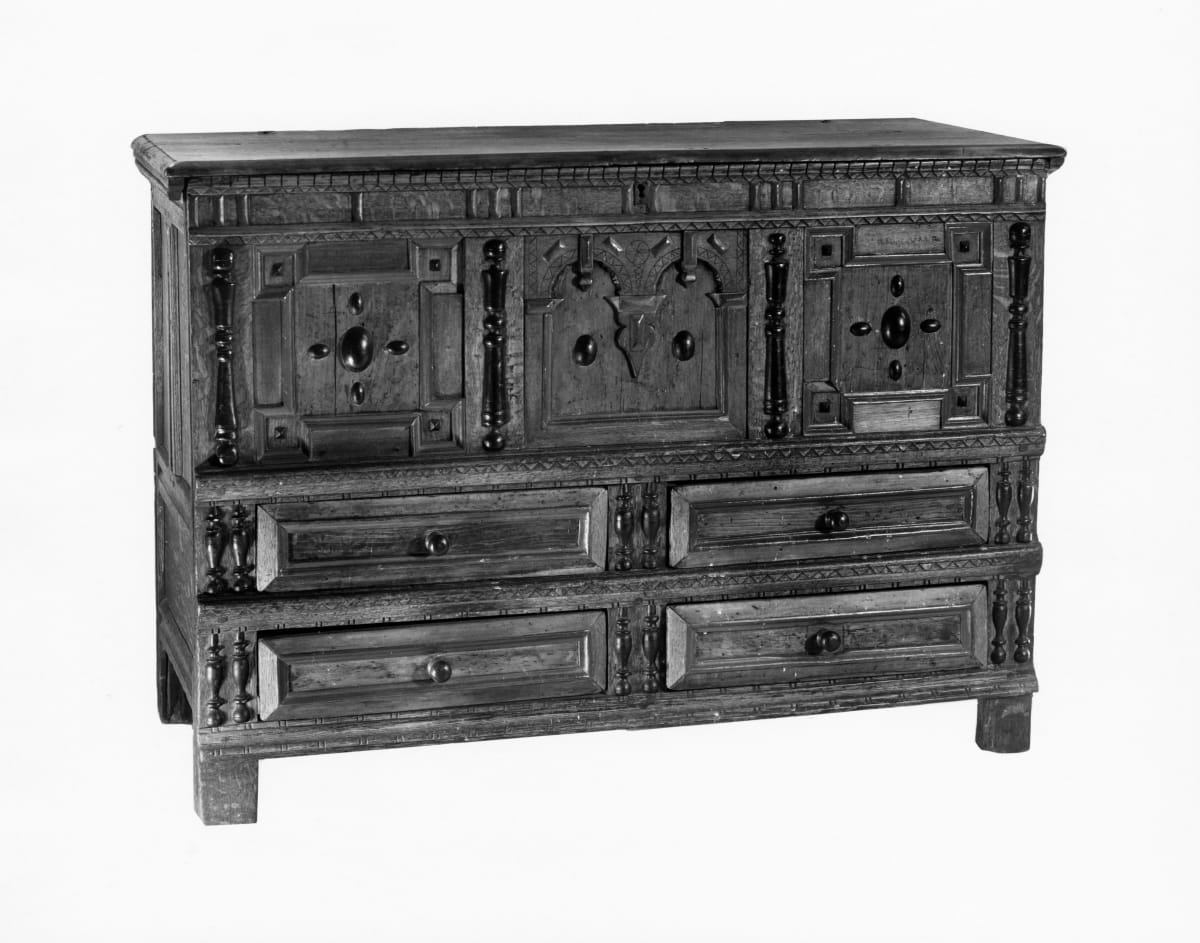 This oak chest with a pine lid was made in one of the towns south of Boston, perhaps, Plymouth or Barnstable, on Cape Cod. Chests of this sort were placed in rooms where guests could see their stylish decorations, showing off the wealth and sophistication of the owner. Complete with locking compartments, they were used to store valuable objects and textiles.