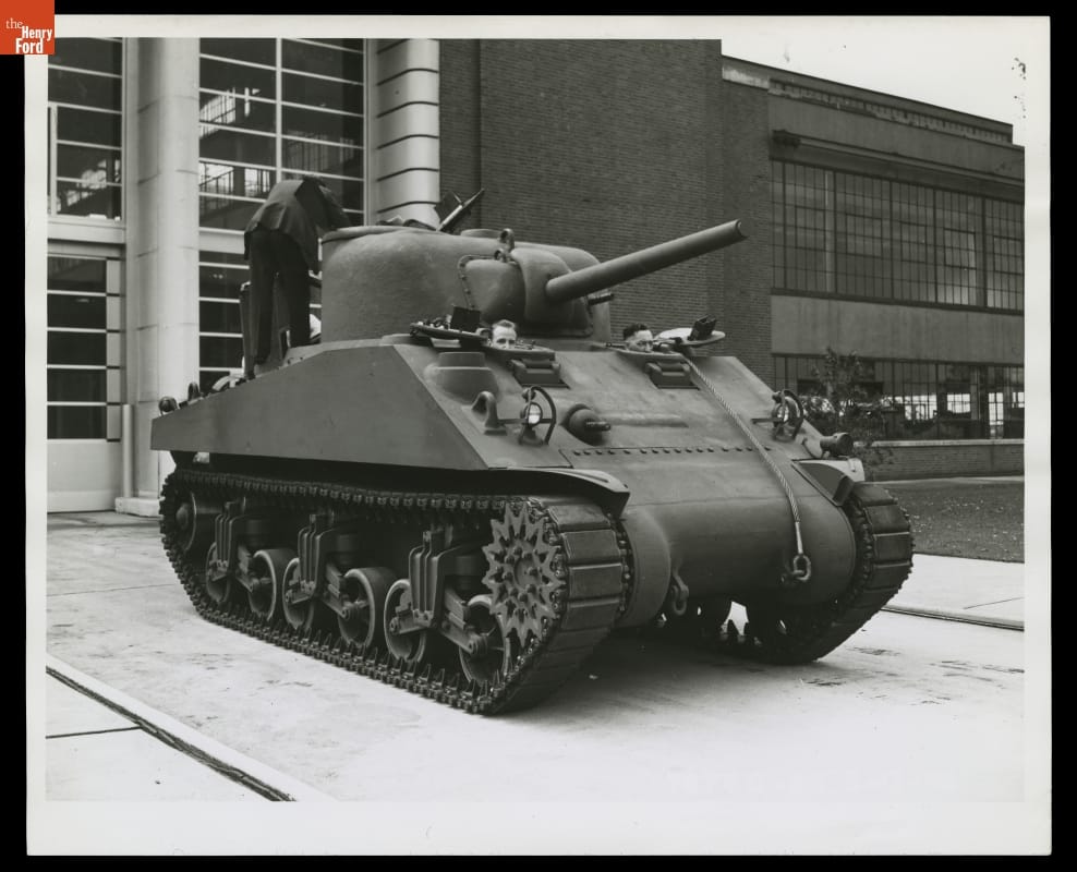 Ford Motor Company repurposed its assembly lines to meet military manufacturing needs during World War II. The last peacetime automobile rolled out of Ford's massive River Rouge plant in 1941, and focus shifted to the wartime production of aircraft engines and military vehicles. The Rouge manufactured M-4 tanks through 1943 and continued producing M-4 engines and armor plates until war's end.