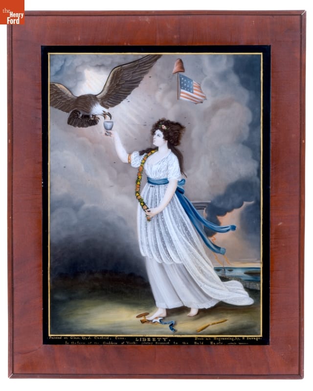 This remarkable reverse painting on glass presents a female figure dressed in a classical Greek or Roman costume, representing the personification of the concept of liberty giving sustenance to the eagle, symbol of the new American republic. To reinforce this message, a "cap of liberty" also deriving its message from ancient Rome, rests atop a flagpole flying the stars and stripes.
