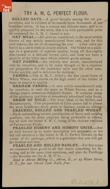 Trade Card for A.M.C. Perfect Cereals, Akron Milling Company, 1885-1895