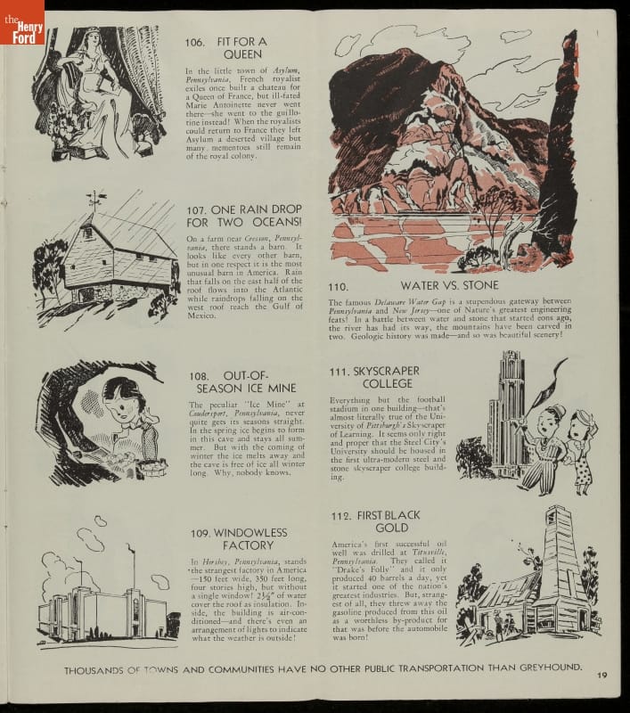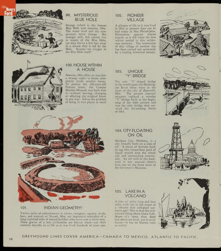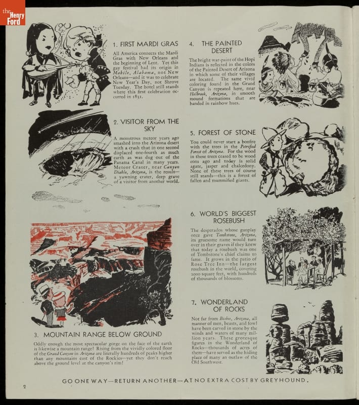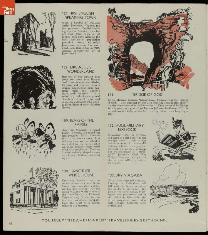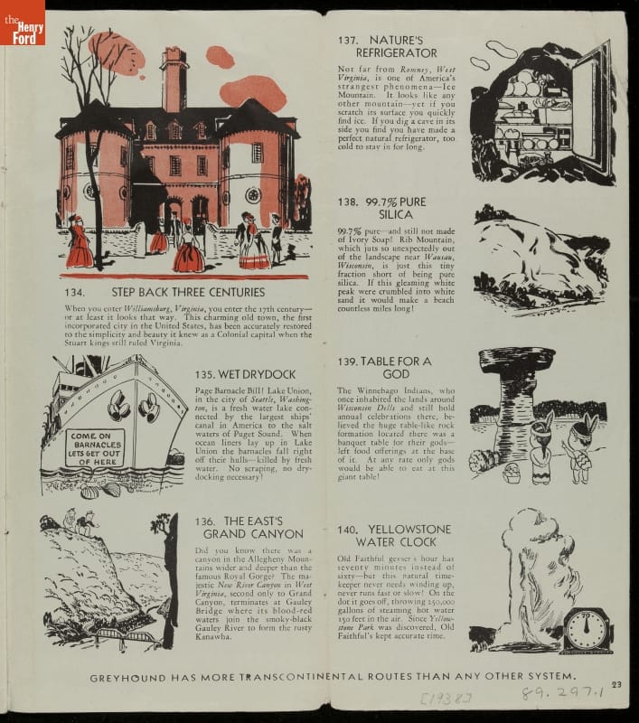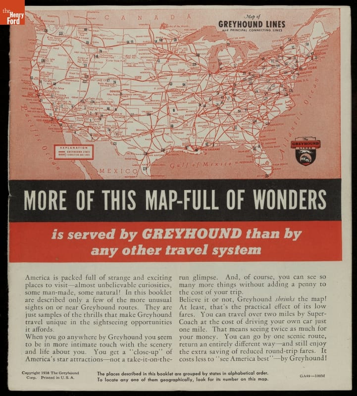 By the 1930s, buses were displacing passenger rail for long-distance travel, with companies like Greyhound and Trailways building national networks that drew crowds of passengers. This Greyhound brochure features historic sites and natural landmarks that are "off the beaten path" but could be easily found along the 50,000 miles of Greyhound bus routes across the United States.