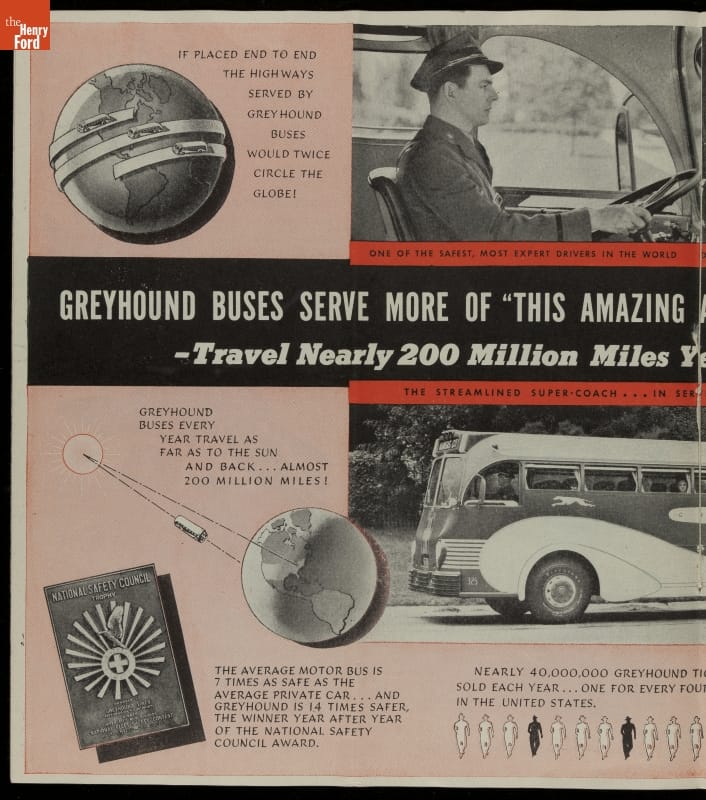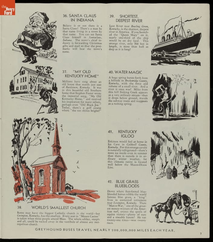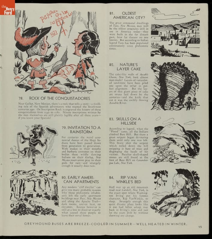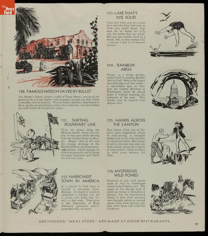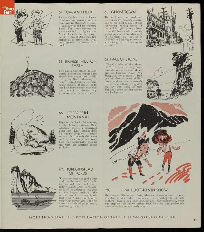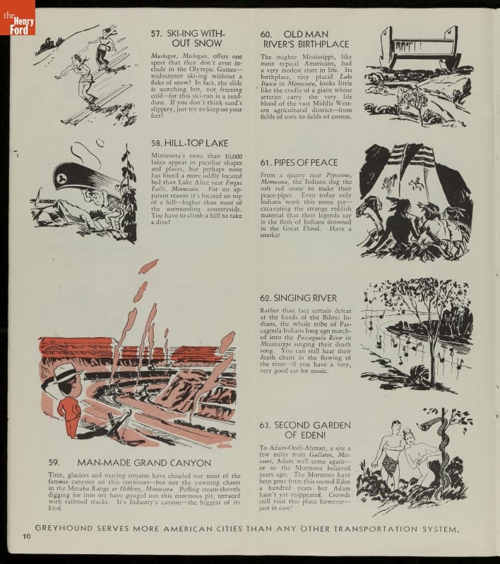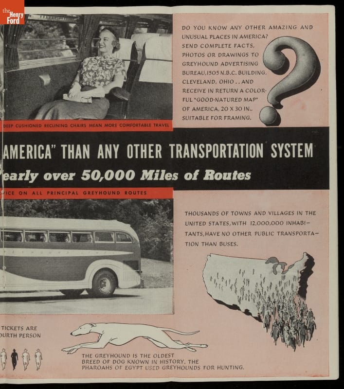 By the 1930s, buses were displacing passenger rail for long-distance travel, with companies like Greyhound and Trailways building national networks that drew crowds of passengers. This Greyhound brochure features historic sites and natural landmarks that are "off the beaten path" but could be easily found along the 50,000 miles of Greyhound bus routes across the United States.