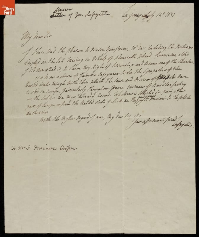 Letter from Marquis de Lafayette to James Fenimore Cooper, 1831