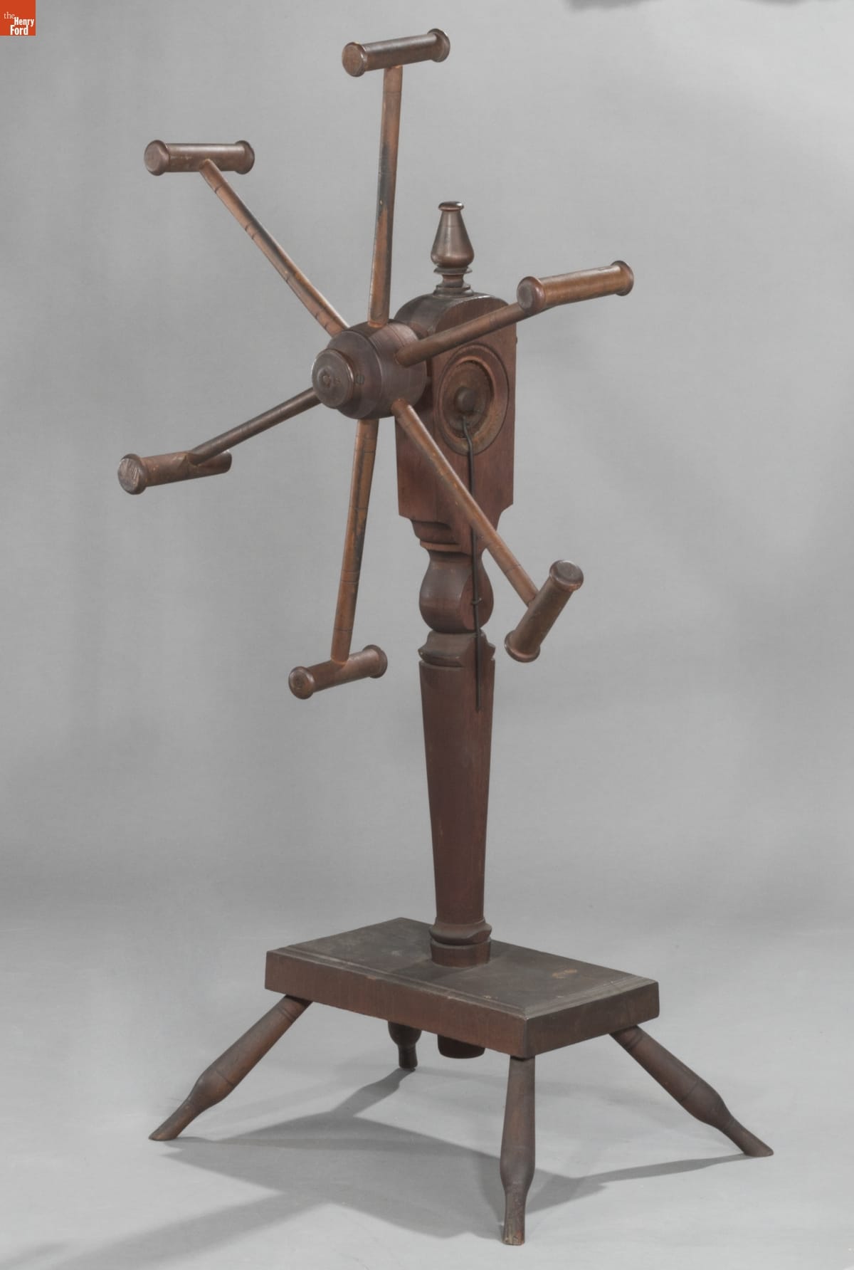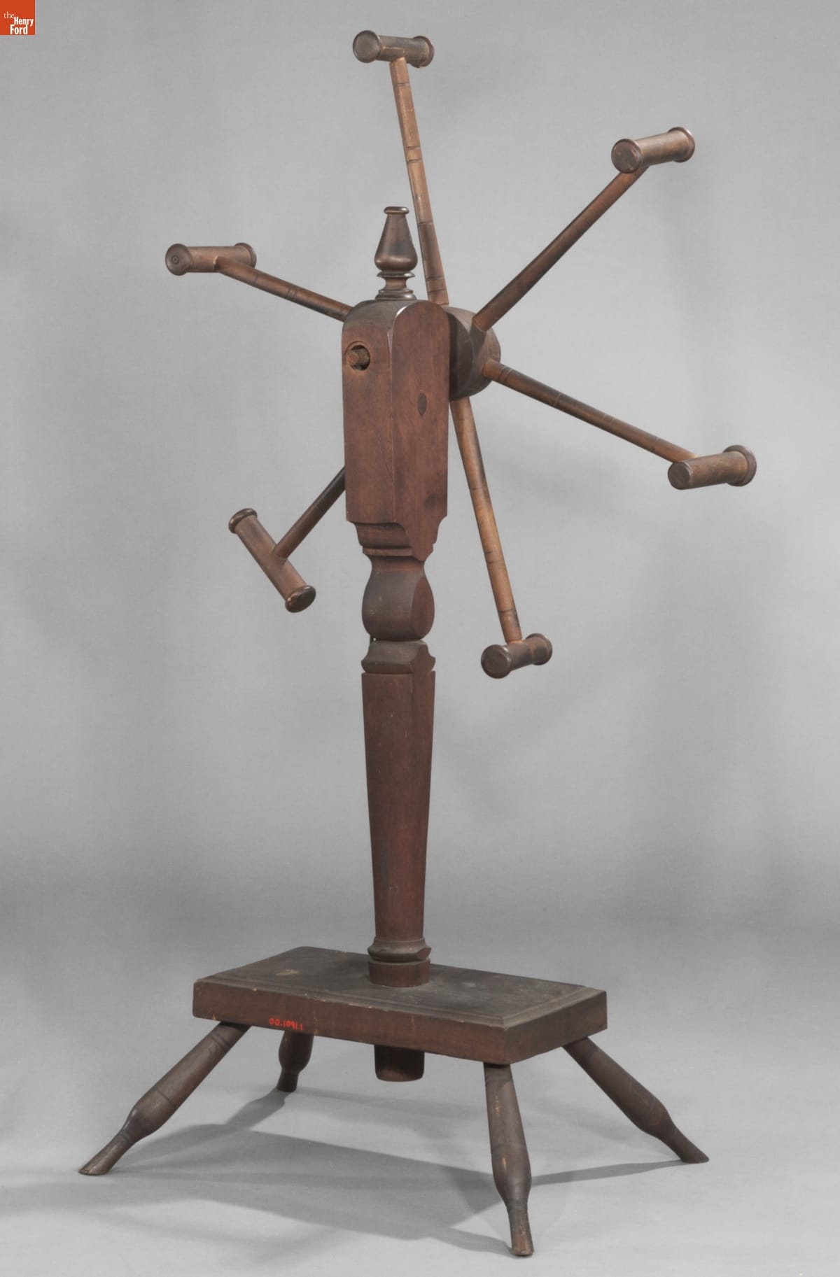 A clock reel is a device used to wind spun yarn into measured skeins. The mechanism is similar to a mechanical clock. The dial's hand is attached to gears that count off the number of times the reel revolves. The dial kept track automatically, making it easy to know how many yards had been spun--without having to keep track in one's head.
