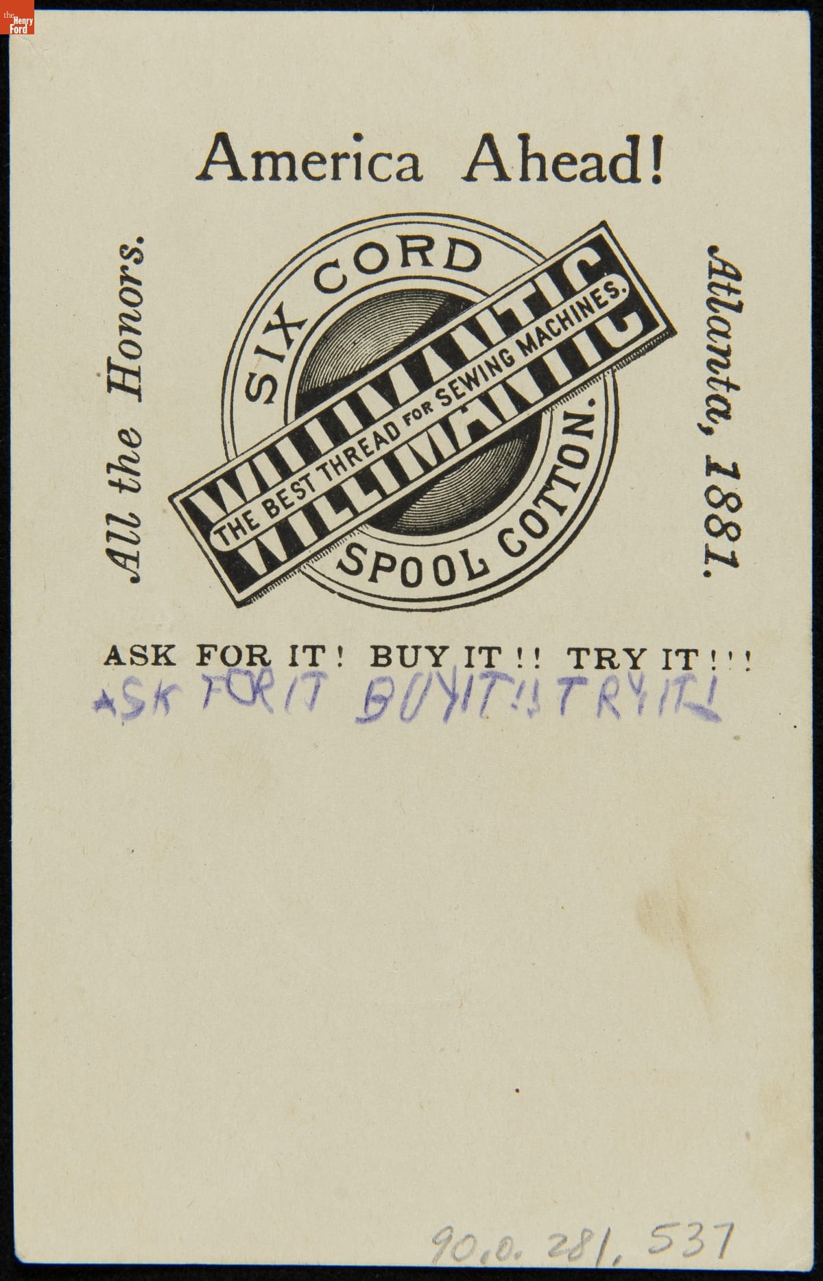 Trade Card for Six Cord Spool Cotton, Willimantic Linen Co., circa 1881