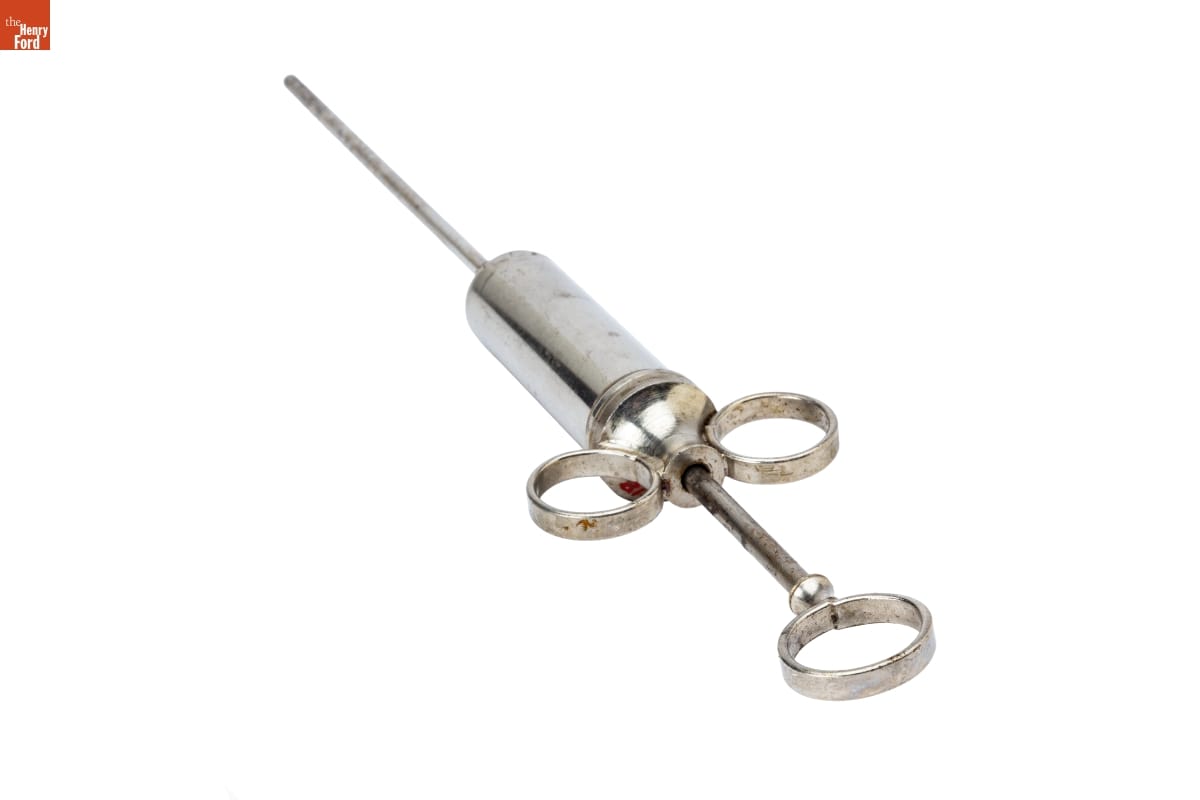 Veterinarians use dose syringes to dispense a specific quantity of medicine. This syringe injects medicine orally into an animal's mouth -- unlike syringes that use a needle to inject medicine intravenously into the bloodstream. Dose syringes like this one, made of metal, were not disposable and had to be sterilized between uses.