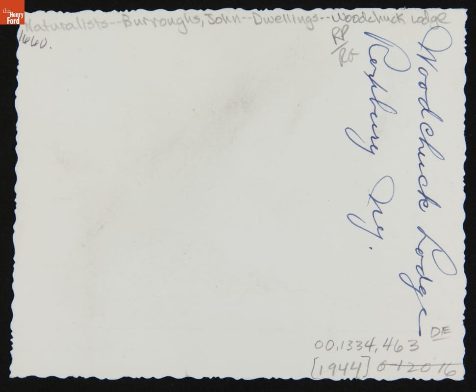 John Burroughs (1837-1921) was an internationally known naturalist and essayist. In 1913, with financial assistance from Henry Ford, Burroughs purchased the house built by his brother Curtis on land near Burroughs's birthplace in Roxbury, New York. Woodchuck Lodge, as Burroughs referred to it, became his summer retreat. Henry Ford purchased the property after Burroughs's death. It was sold back to the Burroughs's son, Julian, in 1947.