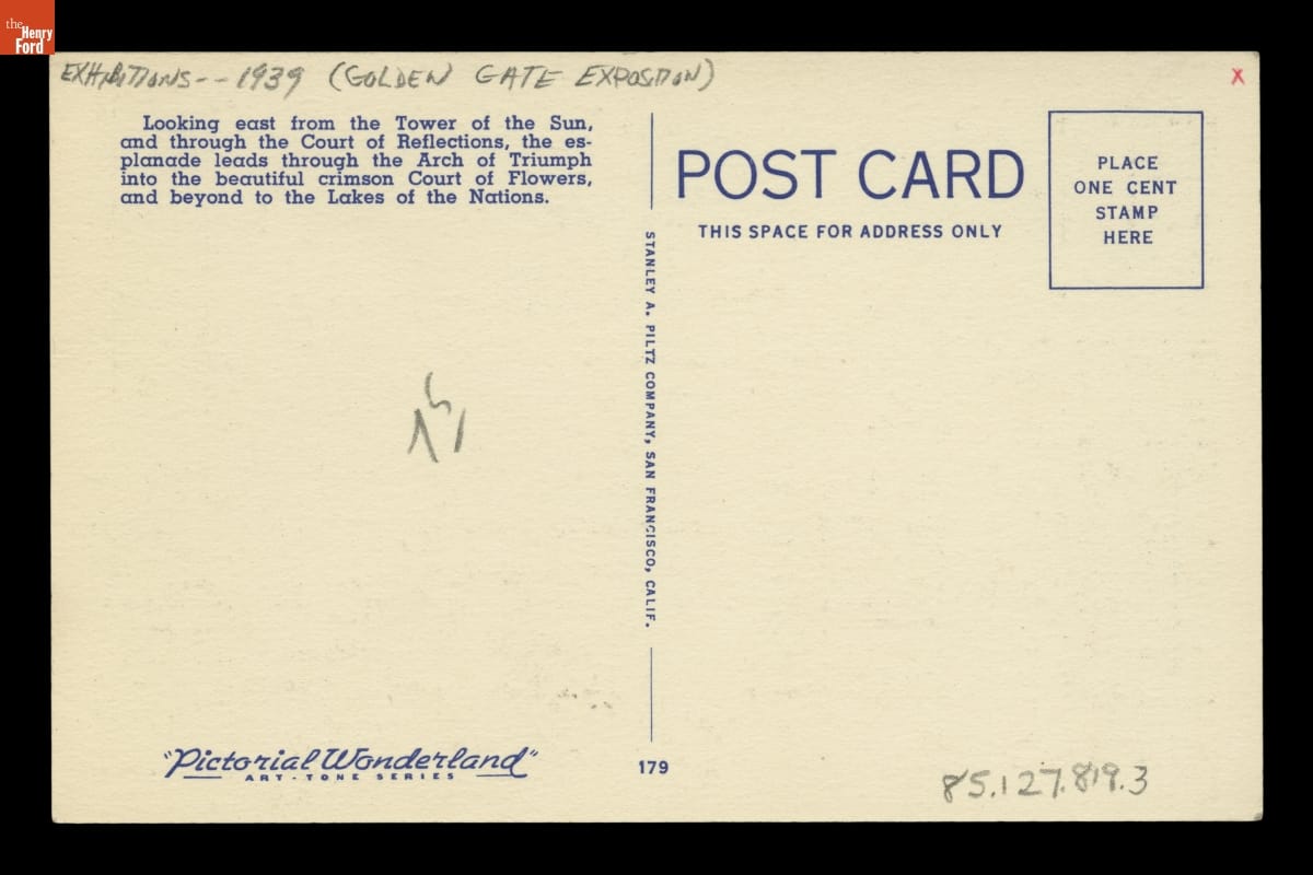 Postcards from the 1939 San Francisco World's Fair depicted colorful images of exposition buildings or other scenes that you could only see at the fair. Many fairgoers bought them to mail to friends or family. Others saved them as an inexpensive souvenir that served as a reminder of their time at the fair.