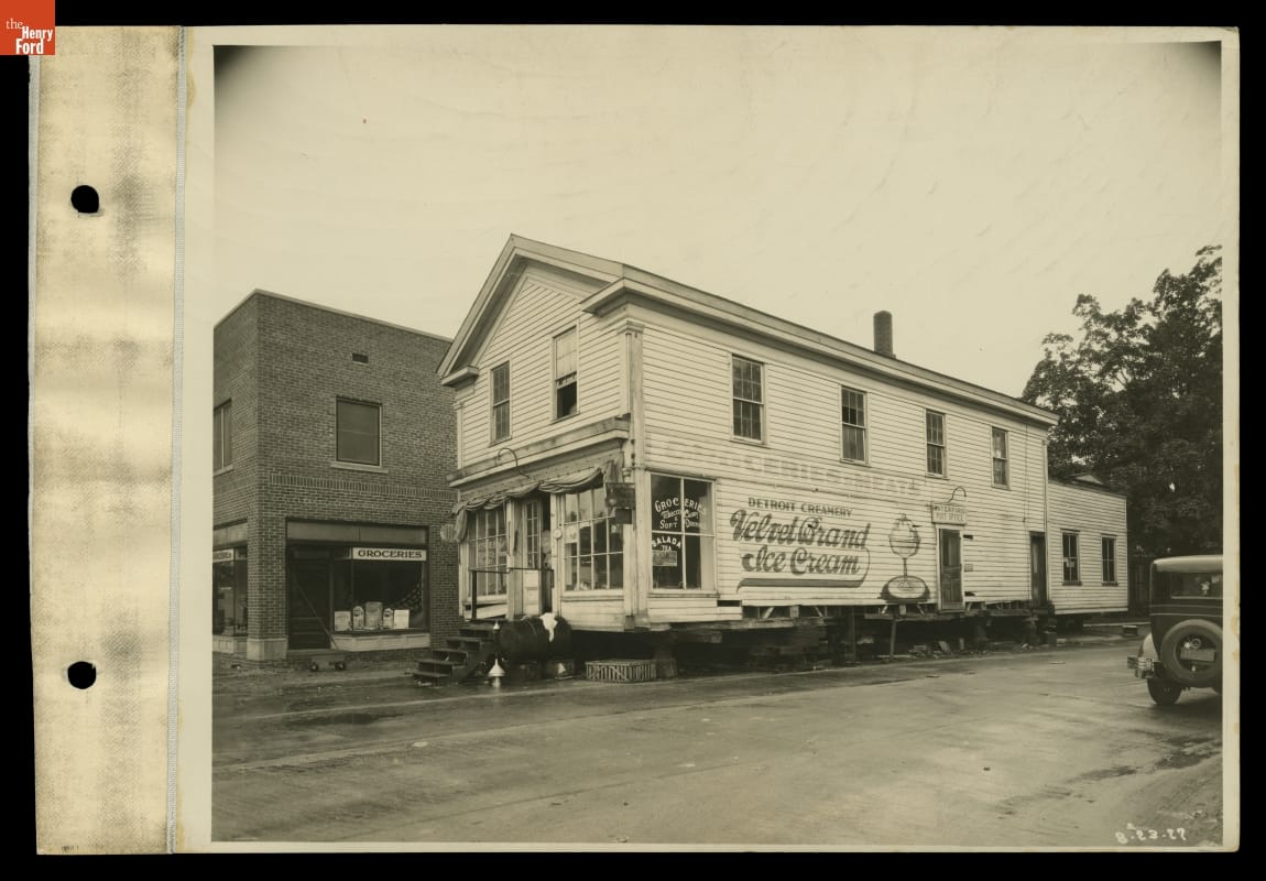 James R. Jones was but one of nine different proprietors who operated a general store in this building between 1857 and 1927. August Jacober was the proprietor of the store when Henry Ford purchased the building in 1927. Ford offered to replace the wooden structure he purchased with a new brick structure, which can be seen in the background here.