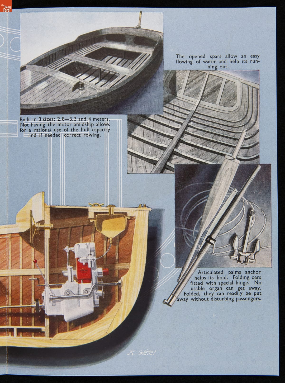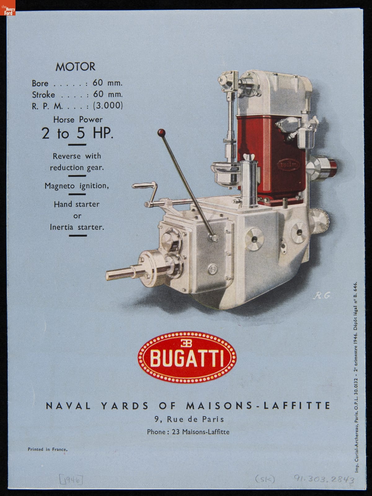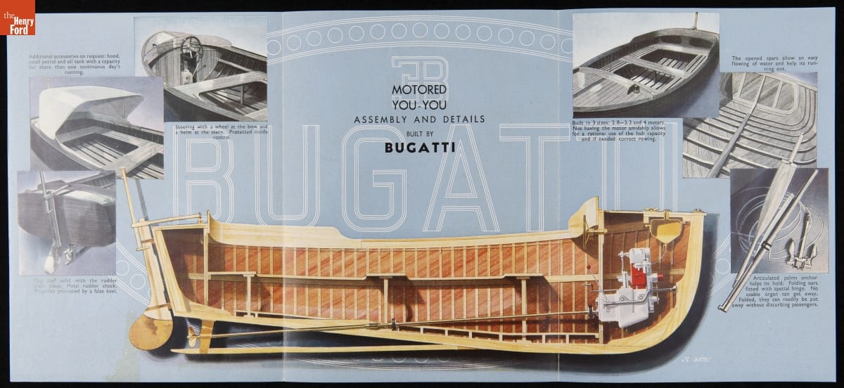 Following World War II, Ettore Bugatti built a small number of watercraft at his Maisons-Laffitte naval yards near Paris. Prototypes of the Type 75 You-You boat were produced in three different lengths, with space in the bow for a small inboard motor. The project ended soon after Bugatti's death in 1947, but not before thousands of brochures had been printed.