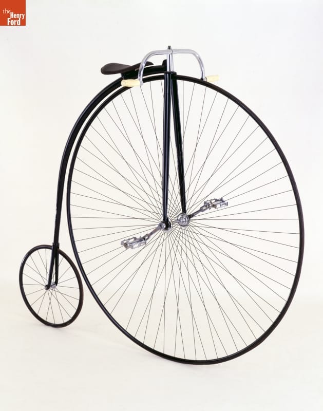 Many cyclists loved to race. This high-wheel racing model was made in 1886 by Humber and Company, an English firm. The cyclist would hump over the large front wheel -- this one is 55 inches tall -- trying to out-pedal competitors. By the early 1890s, a faster machine would prevail -- the low-mount safety with equal-sized wheels, chain drive, and pneumatic tires.