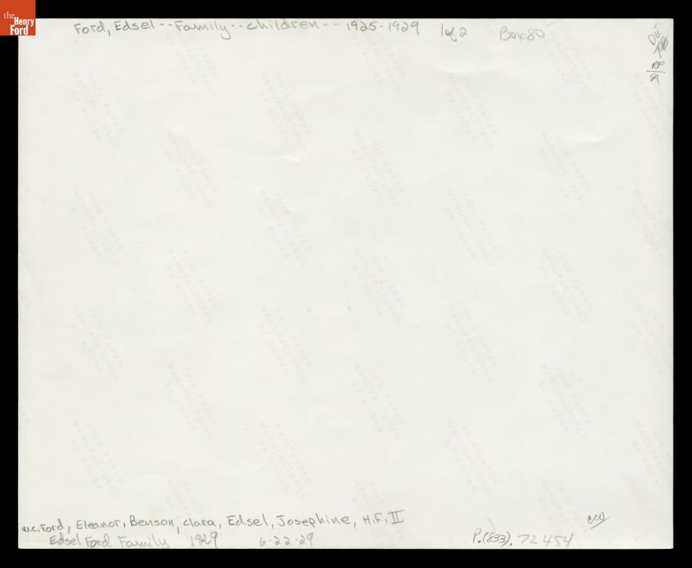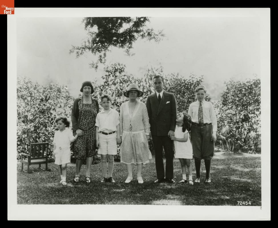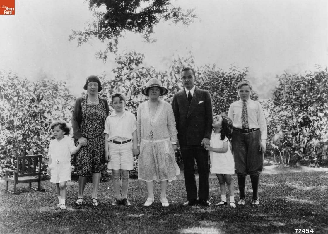 Edsel Ford, son of automotive industrialist Henry Ford, moved with his family into a new Albert Kahn-designed home they named Gaukler Point in Grosse Pointe Shores in 1929. This might be where this 1929 photograph was taken. Clara Ford (center) joined her son and his wife Eleanor with their four children (left to right) William, Benson, Josephine, and Henry II in this family portrait.
