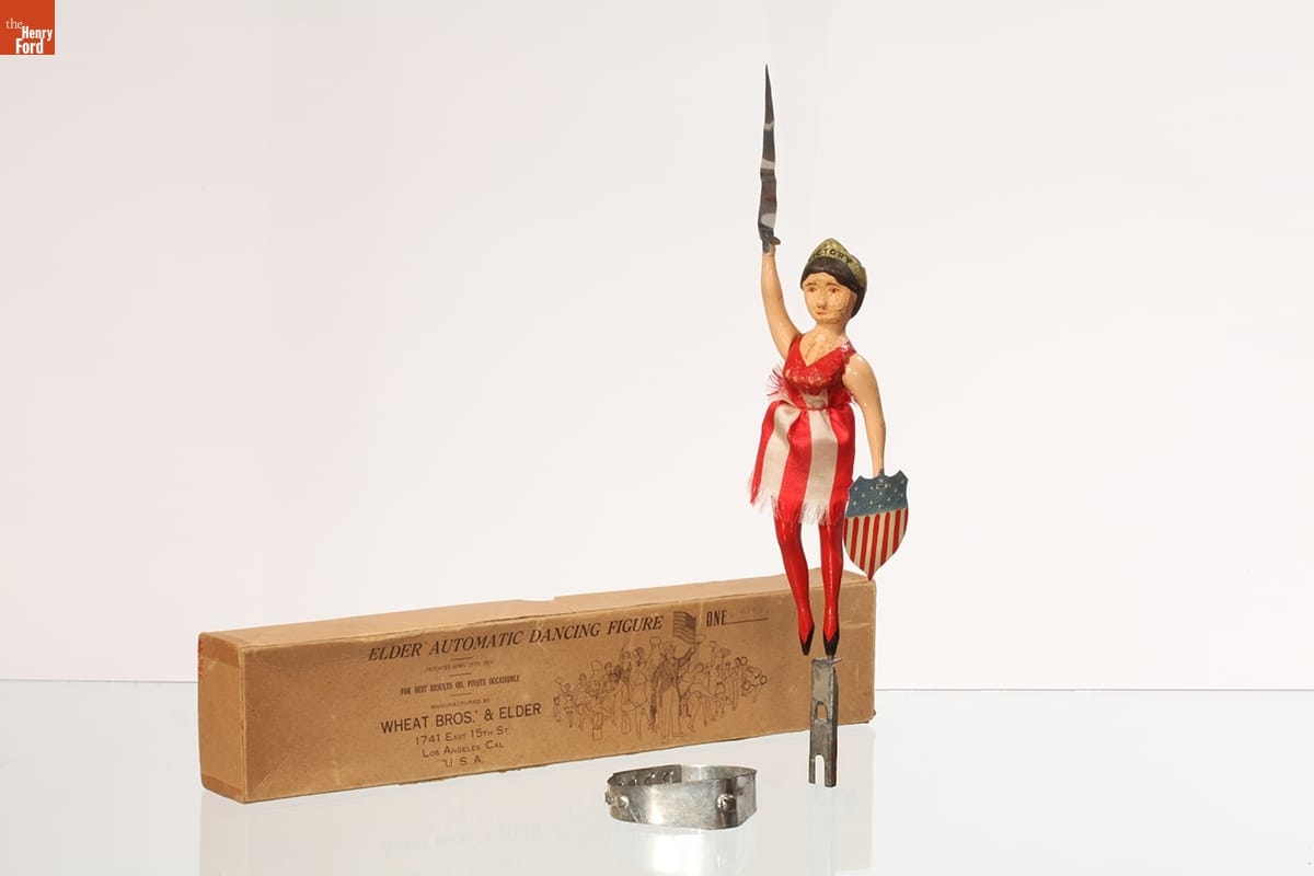Printed on box: Elder Automatic Dancing Figure / One: Victory (stamped) / Patented April 25th 1916 / For best results oil pivots occasionally / Manufactured by / Wheat Bros. & Elder / 1741 East 15th Street Los Angeles Cal. USA