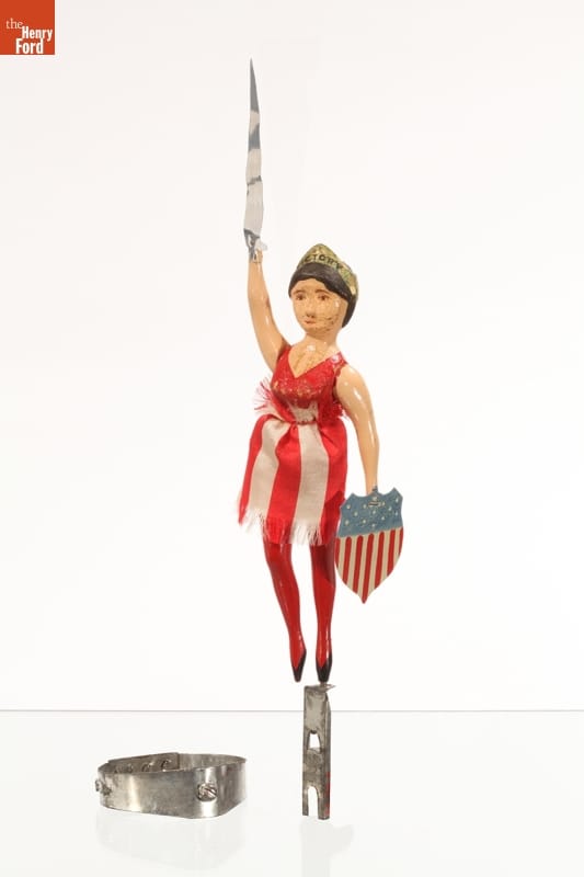 Decorative aftermarket hood ornaments or mascots came in a wide variety of styles and prices in the early 20th century. Any car owner with some extra cash could personalize their vehicle. This dancing "Victory" mascot appealed to patriotic Americans who supported the country's war effort during World War I.