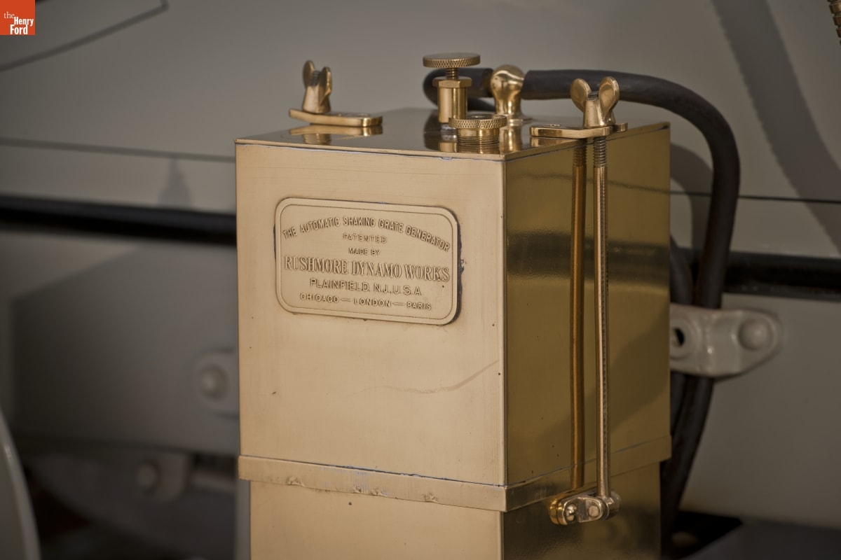 On generator on right running board: The Automatic Shaking Grate Generator/ Patented/ Made by/ Rushmore Dynamo Works/ Plainfield NJ USA