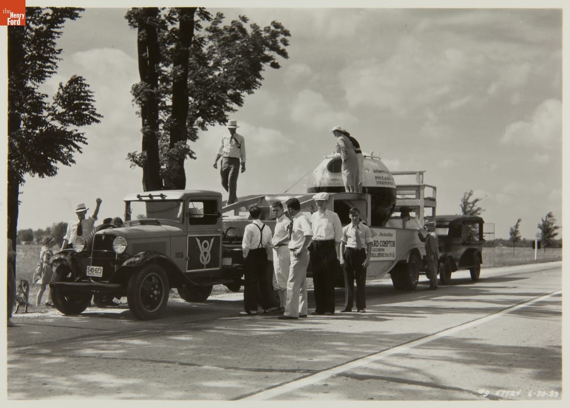 The Piccard-Compton Stratosphere Balloon launched in August 1933 at the Chicago World's Fair, piloted by Lt. Commander "Tex" Settle. The magnesium gondola and hydrogen balloon quickly crashed soon after launch due to an open valve. It is shown here in June, hauled by a Ford V-8 truck. Jean and Jeannette Piccard successfully relaunched it in October 1934 from Ford Airport.