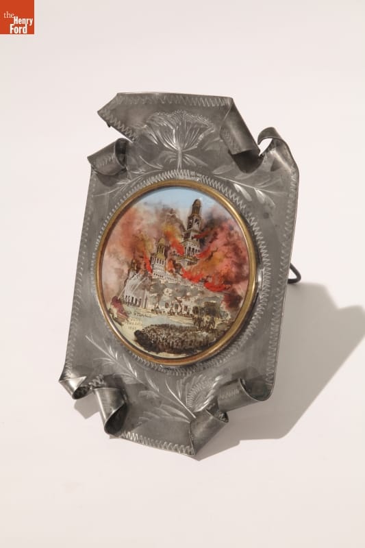 On July 10, 1893 the Cold Storage Building at Chicago's World's Columbian Exposition was destroyed by fire. The building stored perishable food used by fair vendors and also doubled as an ice rink. The scene of its destruction is depicted in this small painting. The fire did not deter visitors -- over 100,000 visited the fair the following day.