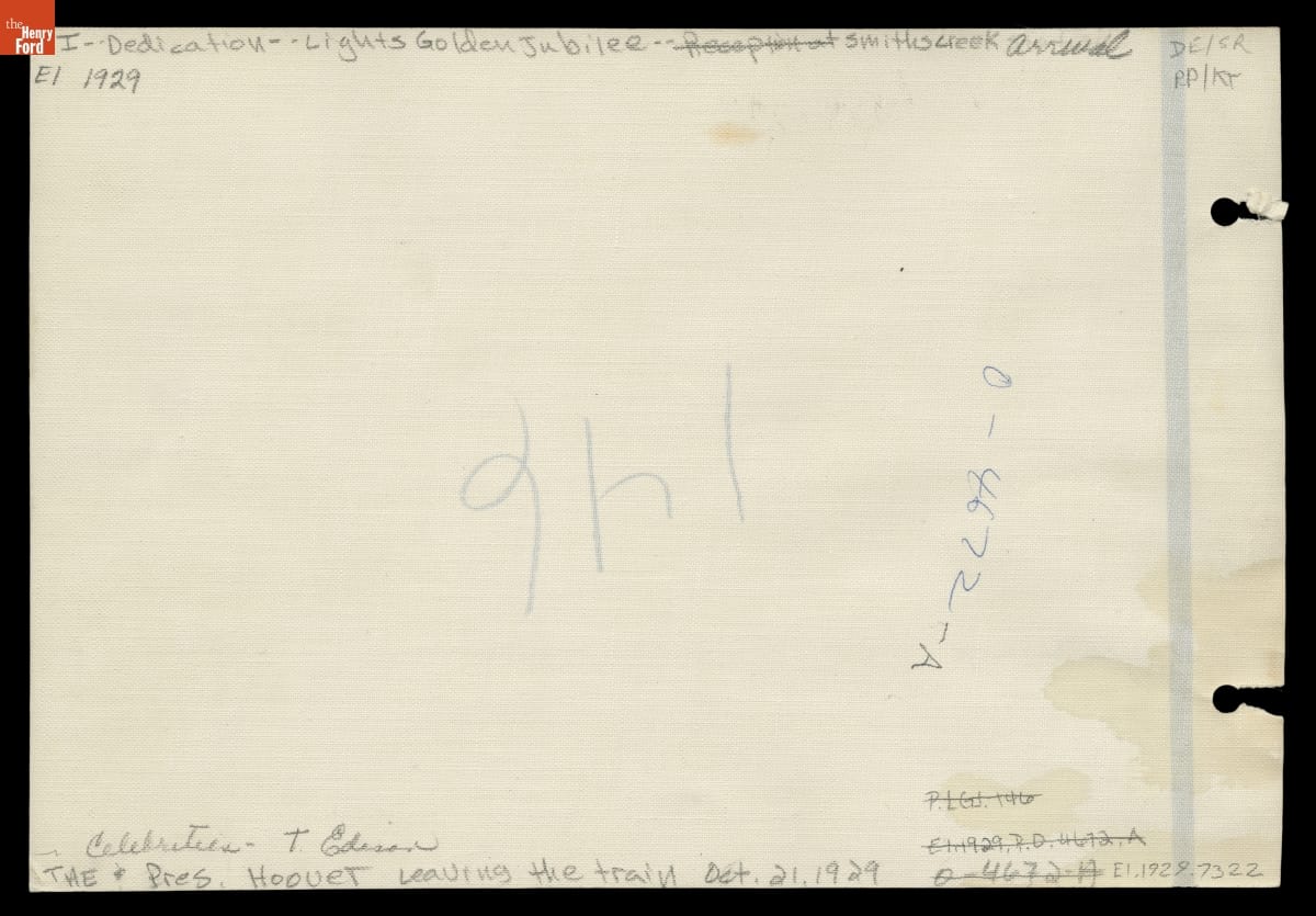 On October 21, 1929, Henry Ford hosted an elaborate celebration in Dearborn, Michigan, to honor his friend Thomas A. Edison. Known as Light's Golden Jubilee, the date marked the 50th anniversary of Edison's invention of a practical incandescent lamp. The day's festivities began with Edison's arrival -- escorted by Ford and President Hoover -- at Smiths Creek Station in Ford's Greenfield Village.