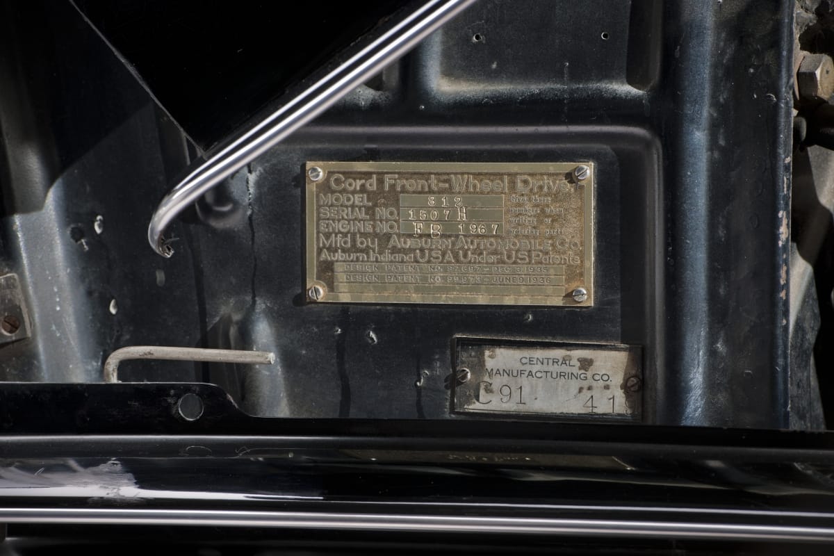 CORD FRONT-WHEEL DRIVE. / MODEL 812 / SERIAL NO. 1507 H / ENGINE NO. F. B. 1967 / GIVE THESE / NUMBERS WHEN / WRITING OR / ORDERING PARTS. / MFG. BY AUBURN AUTO CO. / AUBURN, IN. USA UNDER US PAT. / DESIGN PAT. NO. 97.697-DEC. 3, 1935 / DESIGN PAT. NO. 99.973-JUNE 9, 1936