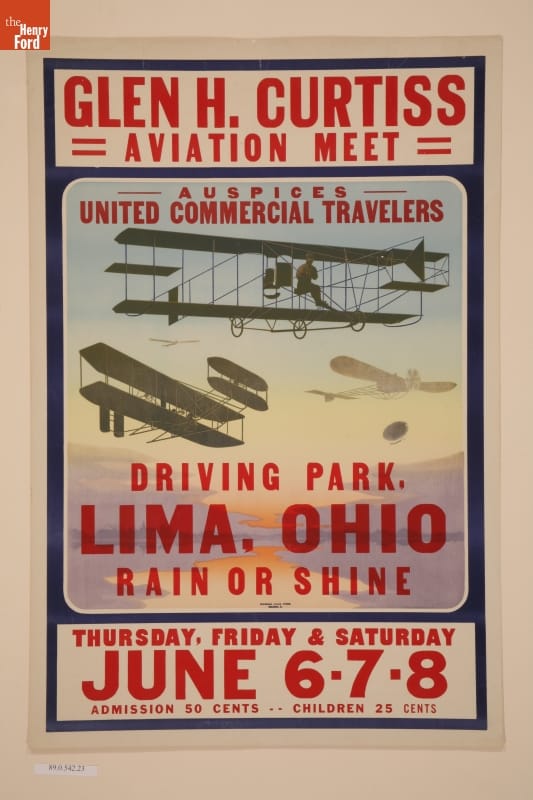 GLEN (sic) H. CURTISS / AVIATION MEET AUSPICES / UNITED COMMERCIAL TRAVELERS / DRIVING PARK, LIMA, OHIO / RAIN OR SHINE / THURSDAY, FRIDAY & SATURDAY / JUNE 6-7-8
