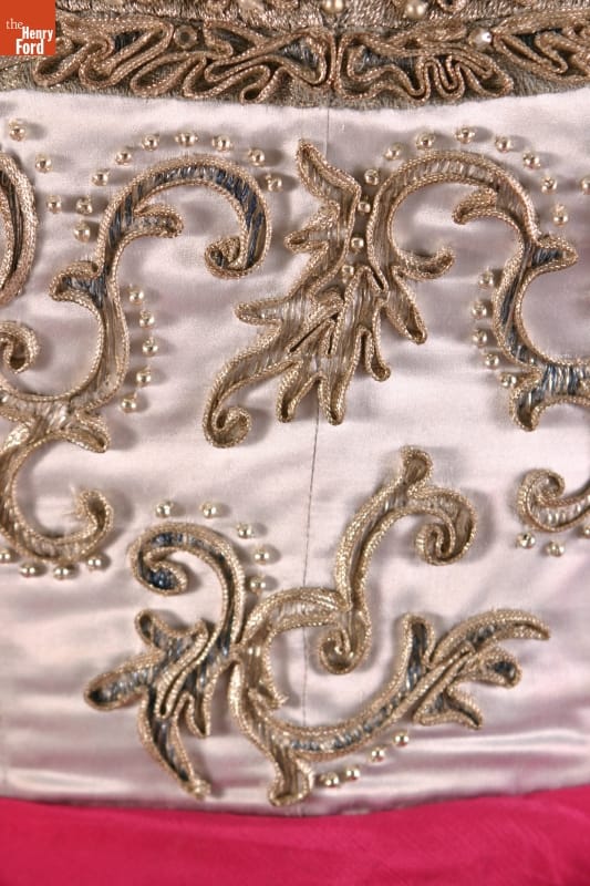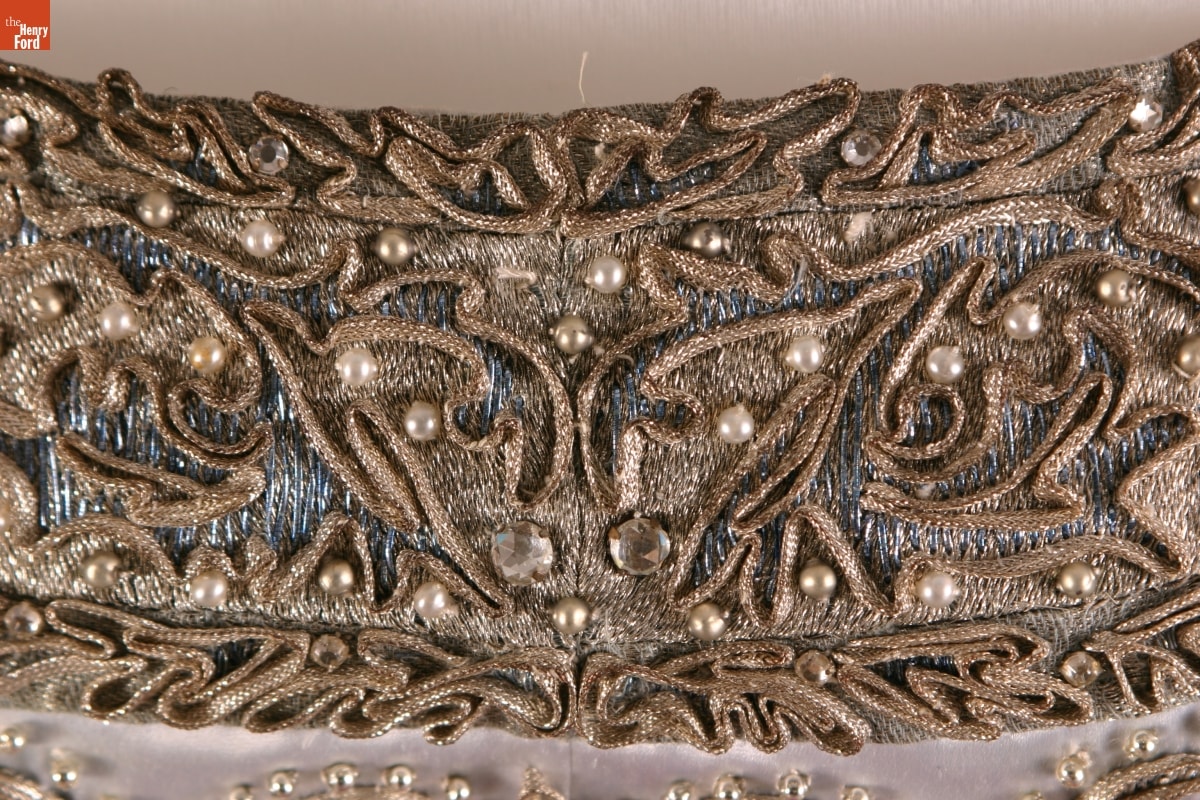 Elizabeth Parke Firestone, wife of tire magnate Harvey S. Firestone, Jr., cultivated a refined sense of fashion through years of interest in clothing design and collaboration with world-renowned couturiers. Firestone favored blues and preferred pinks and fuchsias over true reds. She purchased this pale blue gown with heavy embroidery and a fuchsia sash from the well-known Paris design house of Cristobal Balenciaga.